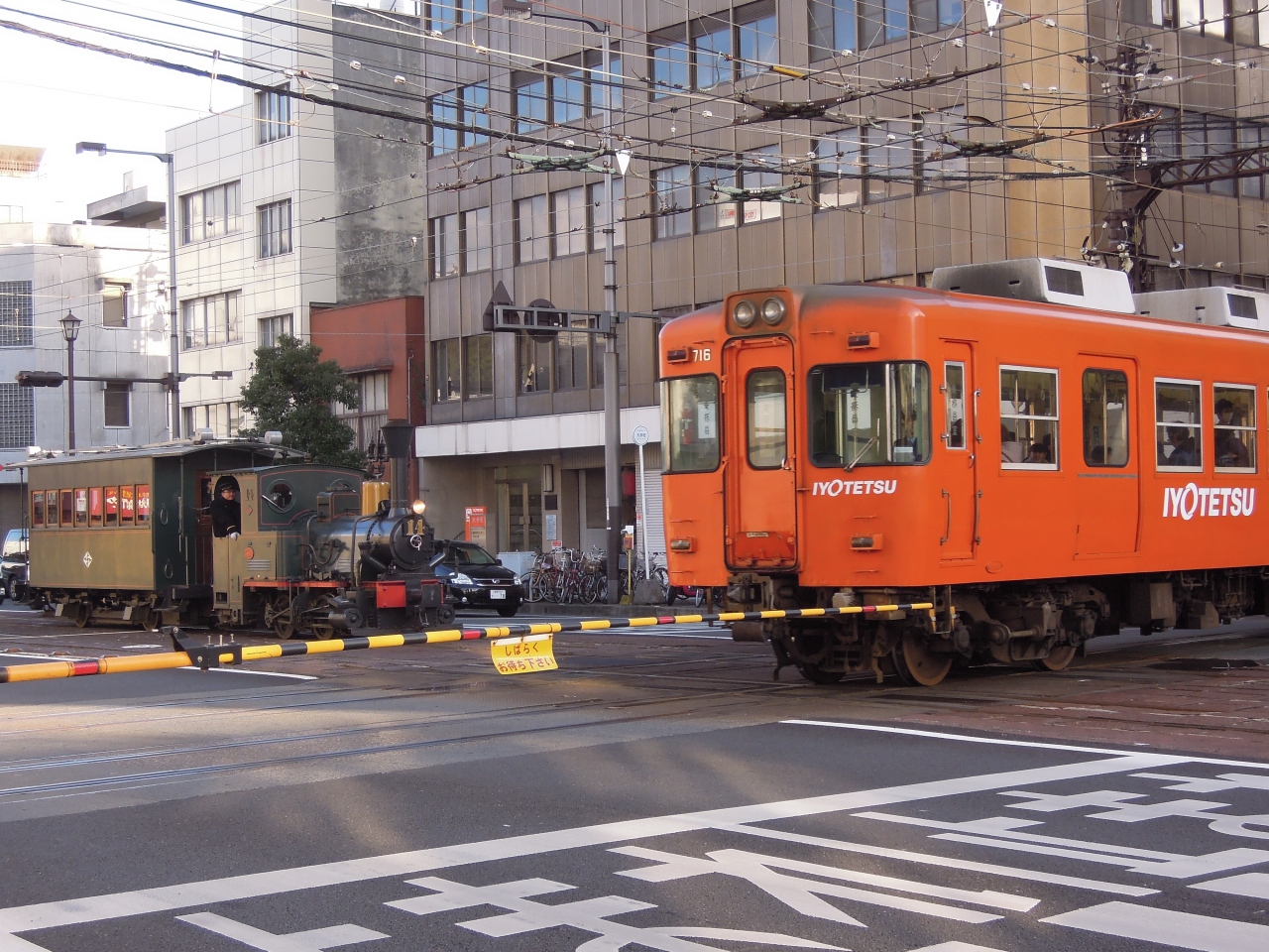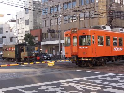 いわゆる「テツ」ではないので詳しくないが、伊予鉄道は鉄道ファンを引き付ける垂涎のポイントをいくつも持っている。そのうちの一つがこのダイヤモンドクロスだ。たまたまJR松山駅から歩いていたら、目前で電車がクロスしたのでシャッターを切った。ふっと周囲を見渡すと、三人ほどがじっとシャッターチャンスをねらっている。しばらく見ていたが、通りを横切る郊外電車が優先のようで、路面電車は電停で待つか、踏切で一時停車してやり過ごしている。一見しただけでは鉄道ファン以外、その価値は把握できないが、国内唯一の路面電車と郊外電車のクロッシングだと説明があれば、もう少し注目を浴びそうな観光スポットだ。