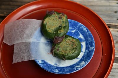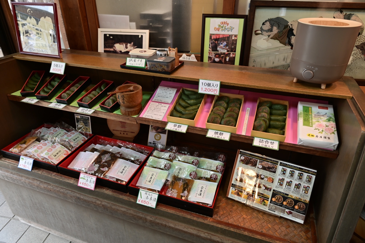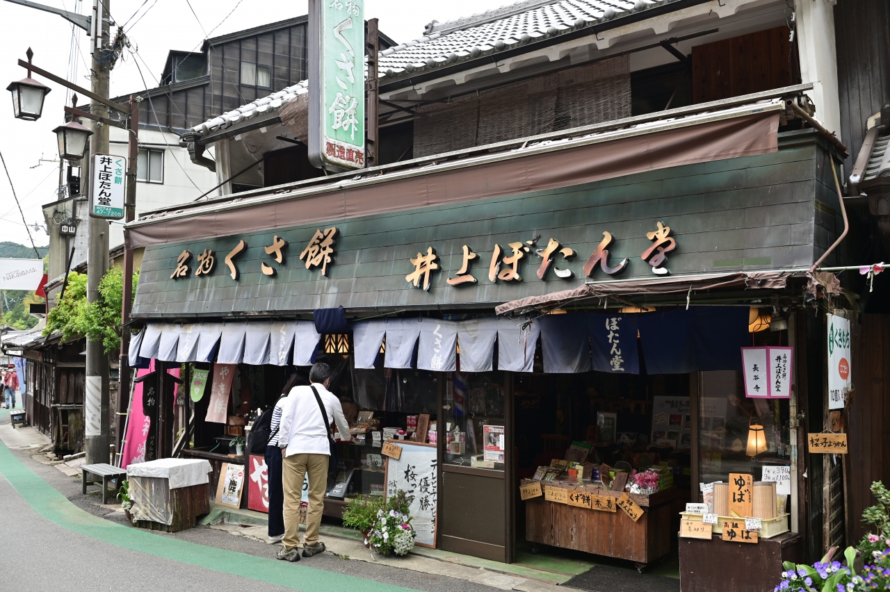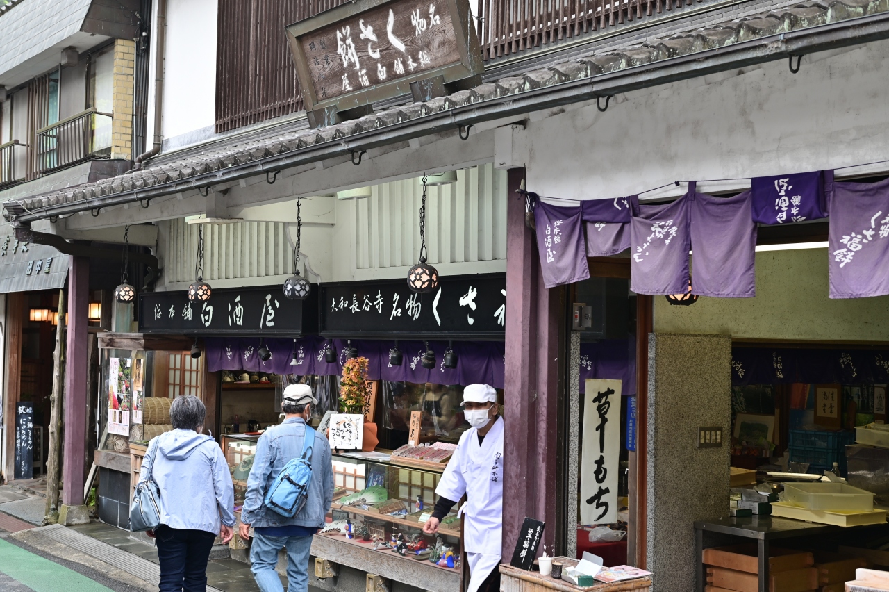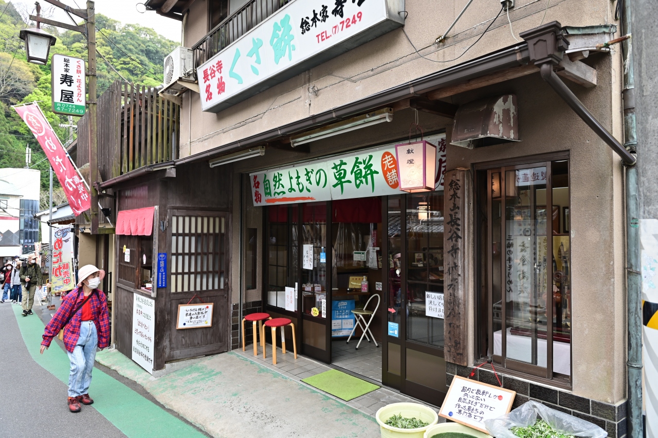 ここも長谷寺門前の草もち店舗だ。「自然よもぎの草もち」「地域で一番」「国内でトップレベル」などのポップ広告が店先にズラリ並んでおり、思わず入店した。店内は和菓子店の雰囲気で、単品のもちだけでなく、箱入りの贈答・土産物用のセットがガラスケースに展示されていた。店内で食せるようにいすが置いてあり、お茶をいただいてほっこりといただいた。焼いたものと生のものを一つずつ。焼くと風味は増すが、〝ヨモギ感〟は生の方が高い。そんな感じがする。