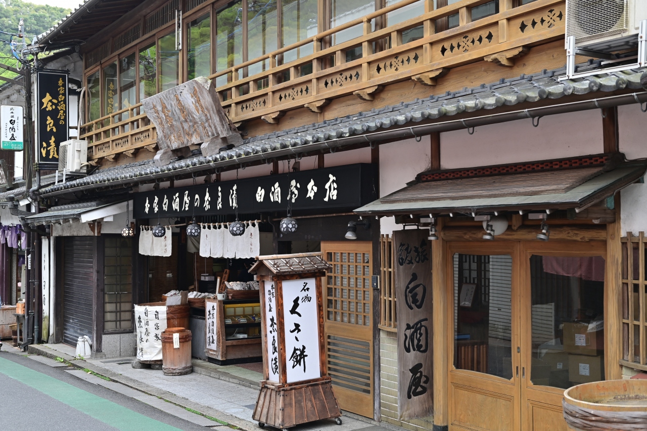 街道に面した老舗の茶屋風建築で、いかにも門前菓子の店というたたずまいだ。ヨモギの「草福餅」と奈良漬を二大名物とする。長谷寺に参拝すると、門前に近いこともあって、いつもここの草もちを食べる。店先で草もちを鉄板で焼くパフォーマンスがいい。思わずのぞき込み、そのうちに列ができて、買わねばならぬ感が湧き上がってくるのだ。
