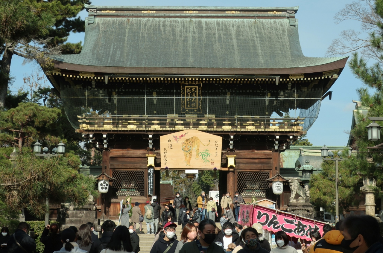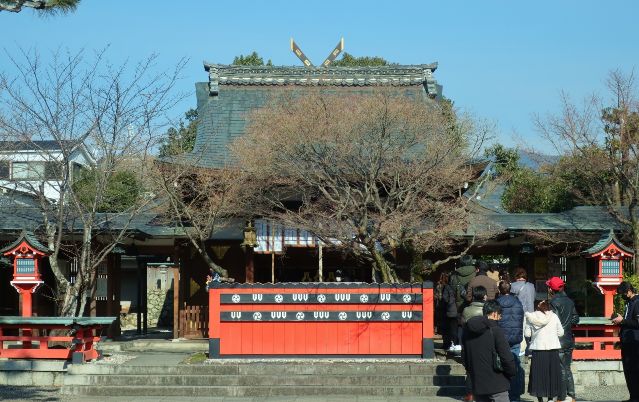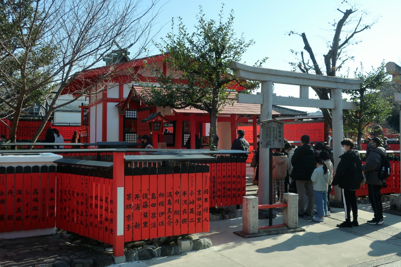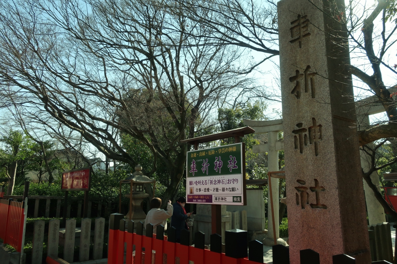 一月の三連休に参拝したが、初詣と思しき人々が参道に列をつくるほど大人気だった。かなりPRに熱心で、ネット上でもコメントが行き交う。お守りなどの授与品、神社のパワースポット化にも成功。境内摂社の芸能神社の人気も相まって、若年層の参拝客も多い。変わった社名だが、いにしえの伝説に由来する。嵯峨天皇が社前を通った際、牛車の軸が折れたことから、門前右側の石を「車折石」と呼んで、祭神に車折大明神の神号を贈った。嵐電の駅が神社のすぐ近くにあり、寄り付きはとてもいい。