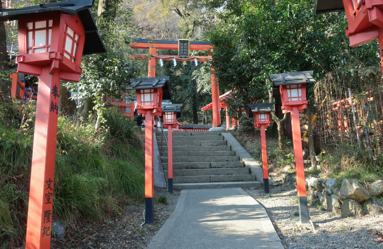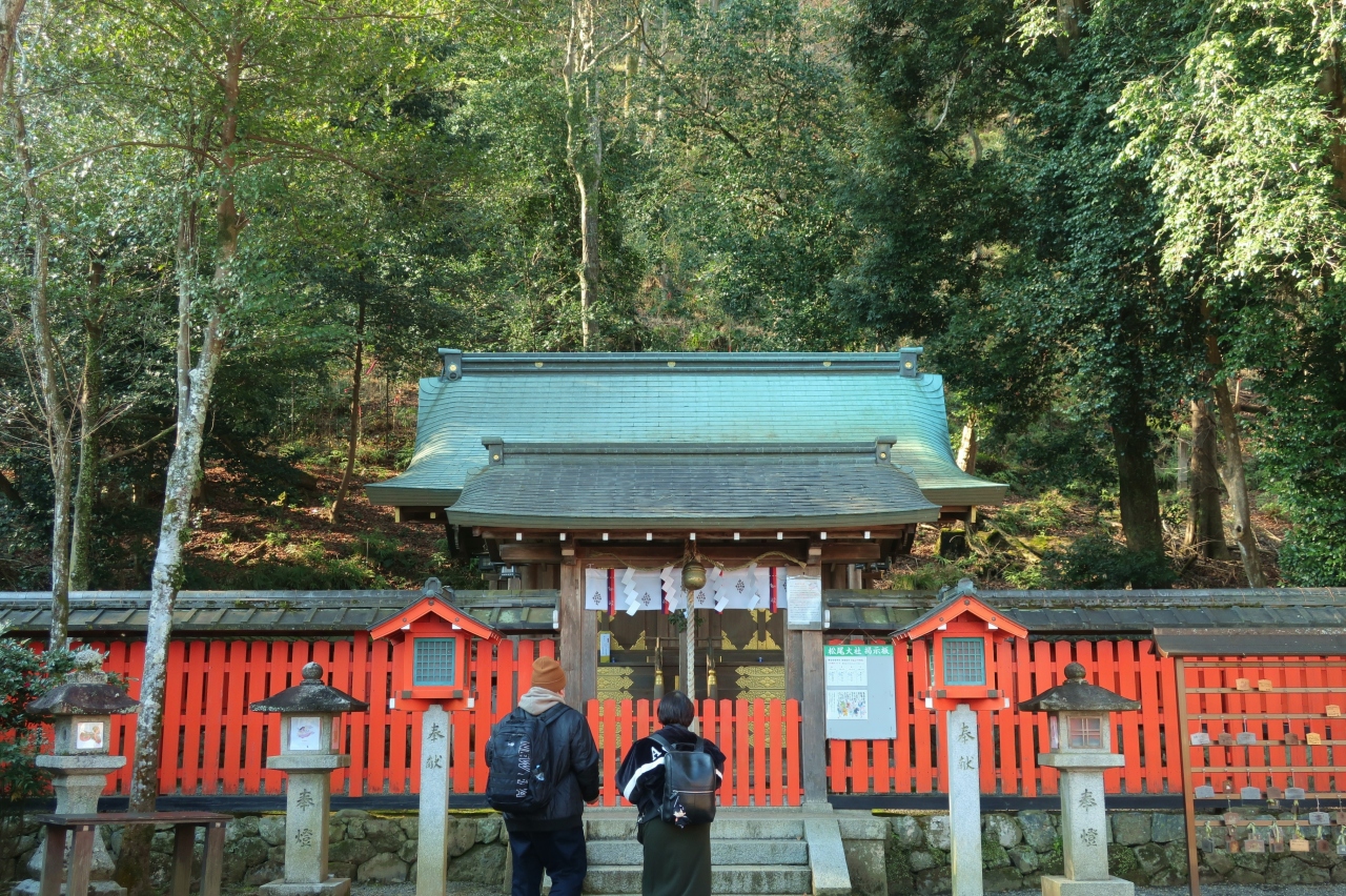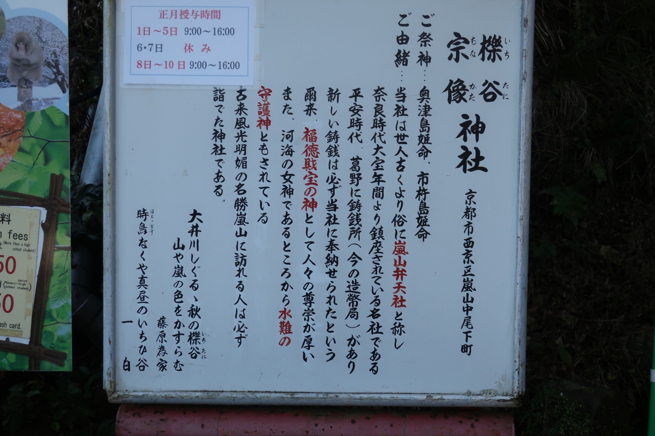 渡月橋を渡った嵐山西岸にある神社で、モンキーパークいわたやまの入り口にある。櫟谷神社と宗像神社を合祀しており、宗像三女神のうち田心姫神と市杵島姫神の二柱を祭る。宗像三女神は弁財天と習合したことから「嵐山弁財天」と呼称されることも。宗像は水の神様、櫟はクヌギのことなので、この辺りの地主神だったかもしれない。現在は松尾大社の摂社という。境内には縁結びの絵馬もあり、人気を呼んでいるようだった。