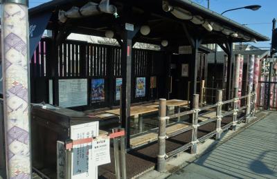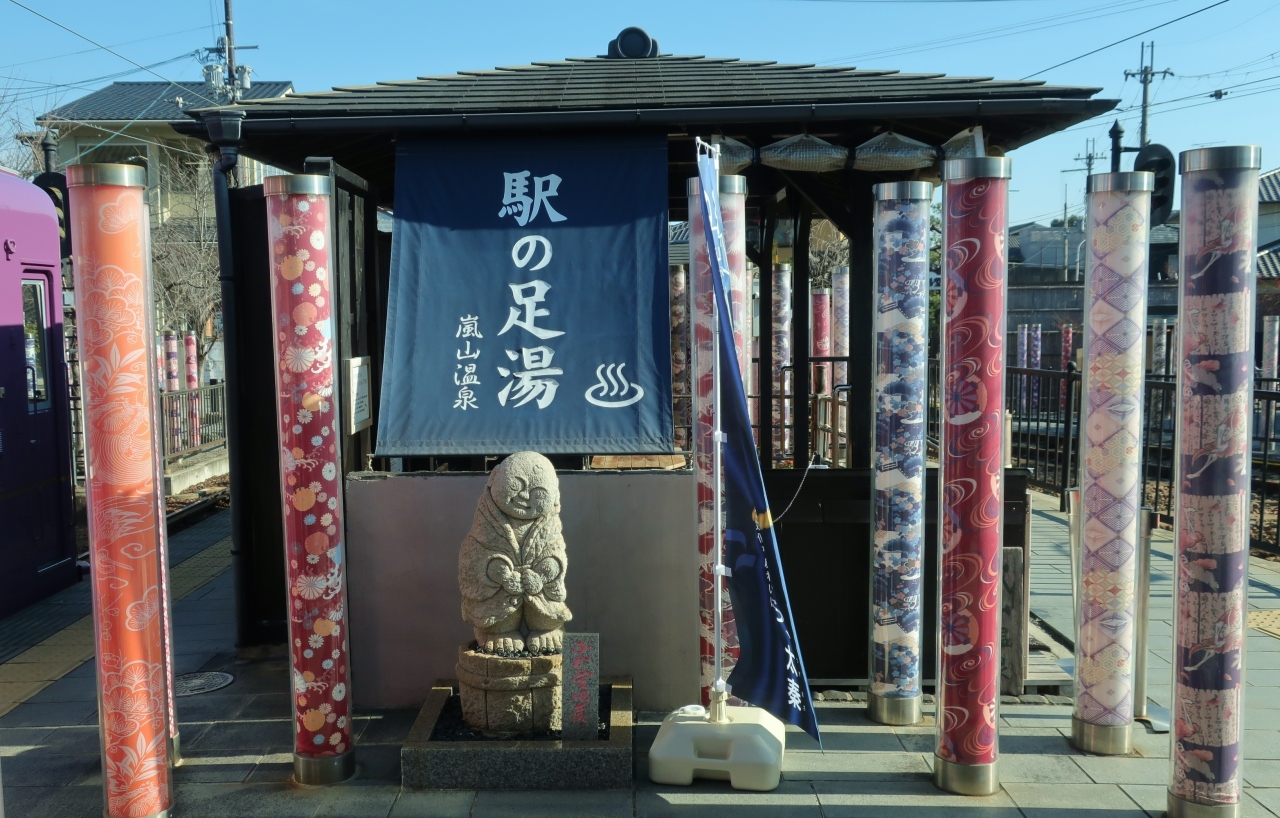 嵐電嵐山駅のホームにある足湯だ。ホームにあるが、ここは改札のない駅なので、キモノフォレスト同様、近くまで立ち寄れる。入湯料はオリジナルタオルがついて200円。近くで湧く嵐山温泉の湯が引いてあるという。キモノフォレストだけでなく停車中の電車も視野に入る。少し変わった風景の足湯だ。