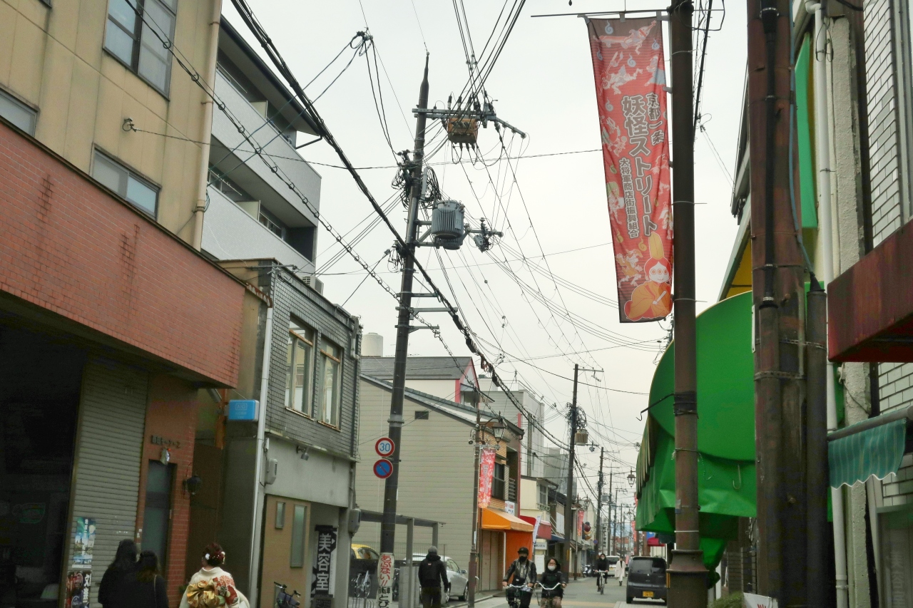 大将軍八神社の門前町的な場所に広がる商店街だ。西大路から北野商店街に接続する約400メートルに20店ほどが並ぶ。地域生活を支えるタイプの商店街だが、大型スーパーの進出などで沈滞。活性化策として標榜したのが「妖怪ストリート」だという。商店街がある一条通は妖怪が練り歩く百鬼夜行の伝説があったことから、近隣の美術大学とタイアップして妖怪が練り歩くイベントなどを展開し、人気を呼んでいる。1月の3連休に訪ねたが、生活型とあって閉店のショップが多かった。平日に訪ねたほうが、商店街の魅力が実感できそうだ。