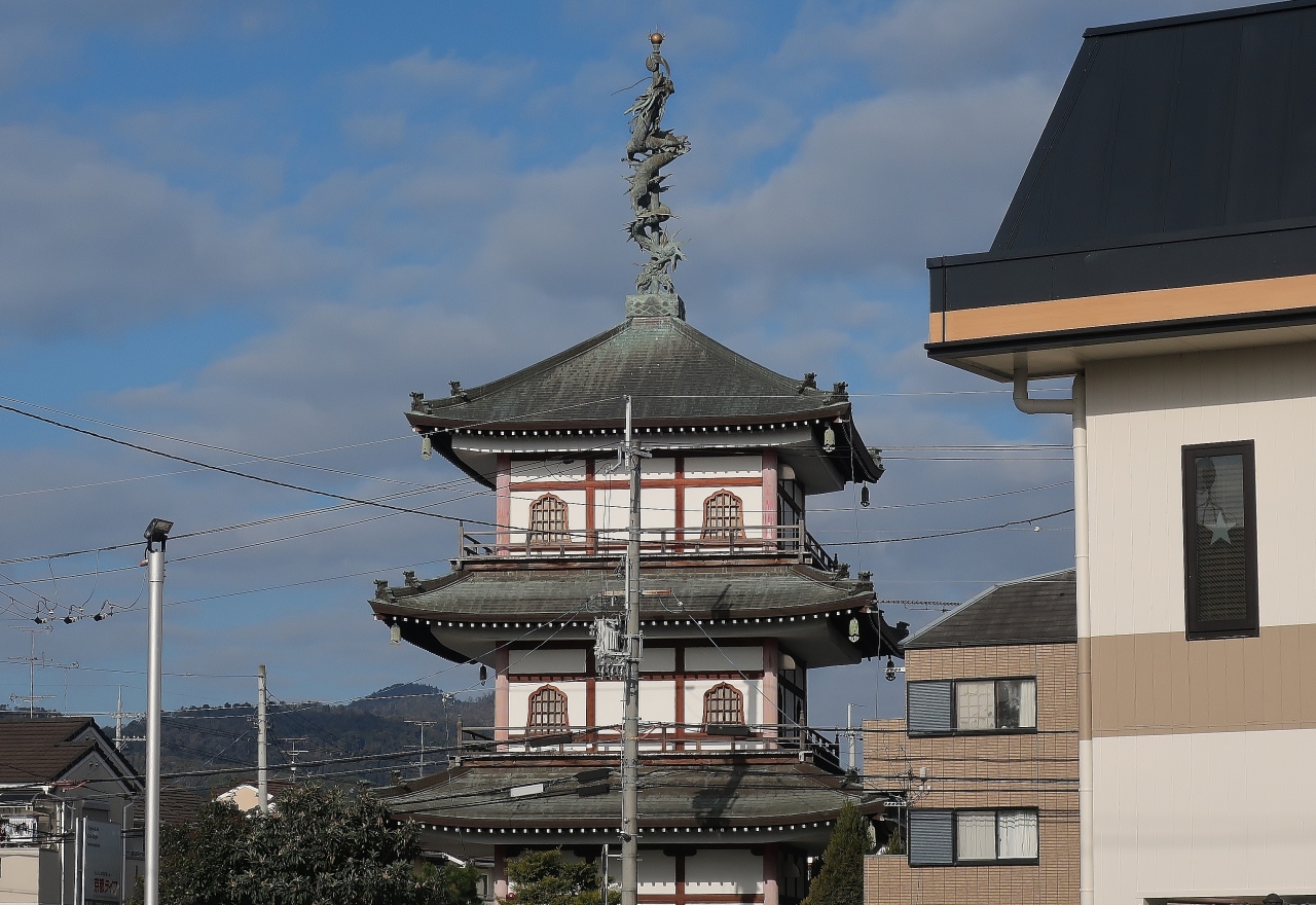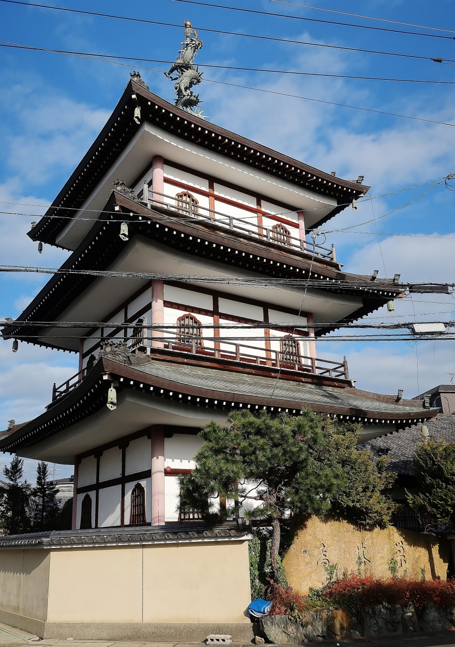 「そうりんじ」と読む。このお寺は何と言っても境内にある三重塔だ。桂離宮を少し北上した住宅街にあるが、周辺の穏やかさとはマッチしない屹立した三重塔はとても目を引く。遠くからも住宅の屋根越しに存在感たっぷりだ。さらに、屋根上の相輪が独特なデザインだ。相輪に登り竜が巻き付いており、遠くからは一瞬なんだろうというフォルムを呈している。臨済宗妙心寺派のお寺で観光的な拝観には開放していない。ネットで判明したが、境内には湯葉の製造販売店があり、通販で売り出している。