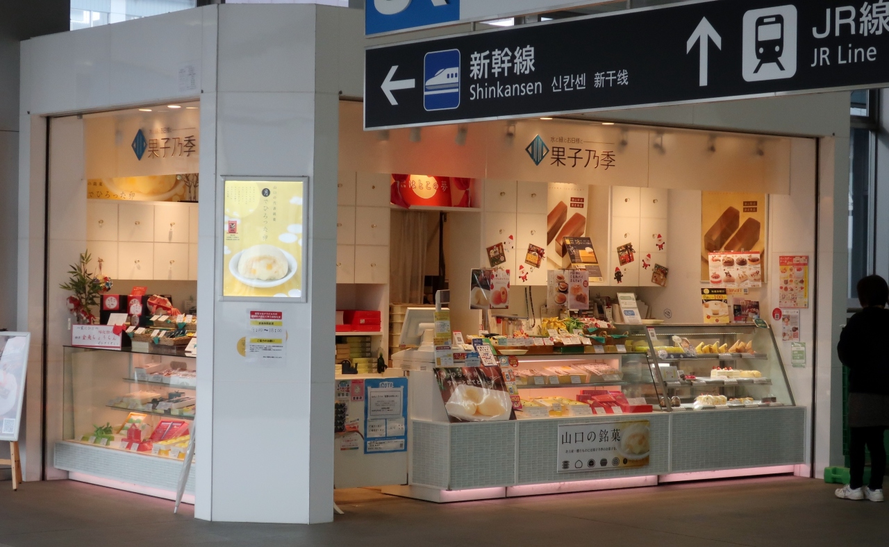 個人的には山口県のお土産としてよく買う菓子「月でひろった卵」。これらを販売する「あさひ製菓」のショップブランドが「果子乃木」で、徳山駅店は改札口手前にあるから観光客にとってはとても便利なショップだ。エキナカのショップらしくコンパクトなスペースに多種多様な商品がわかりやすく並べられている。周南市に出張した時は土産物購入でこの店をよく使う。