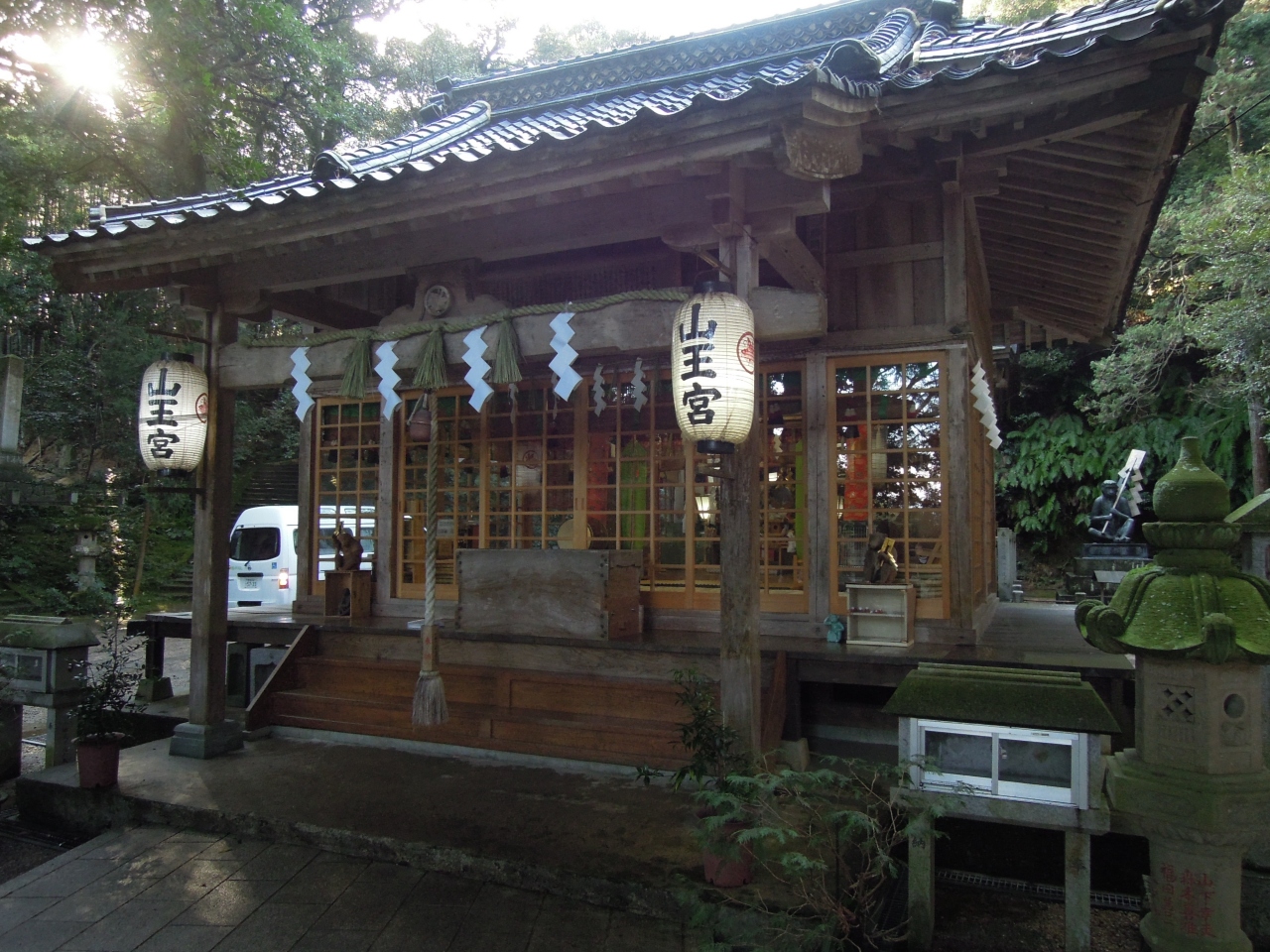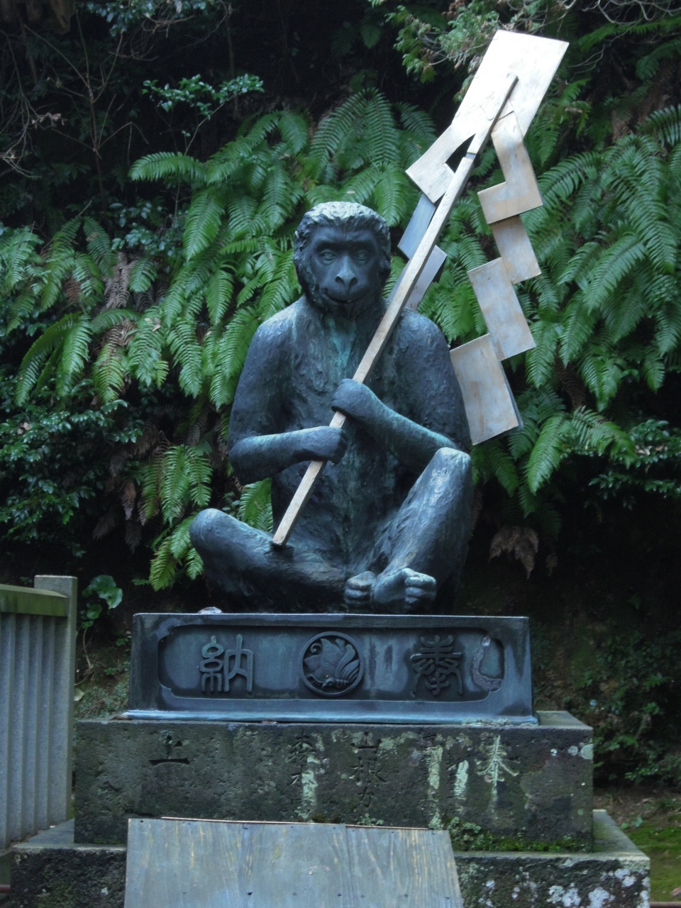 全国に数多くある山王信仰を伝える神社だ。鳥取市郊外の湖山池近くにあり、もしかしたら本社の日吉大社が琵琶湖の近くにあるのになぞらえてこの地を選んだかもしれない。古くから地元の信仰を集めてきた神社という。申年には注目を集めるスポットだ。山王信仰では神の使いとされるサルの像がそこここにある。手水にもサル、子供を抱いたサルと紙幣を持ったサルが狛犬代わりに鎮座ましましている。湖山池近くなので湿地のようだが、そのせいか境内は昼でもなお暗い森厳とした土地で、パワースポットのような場所だ。