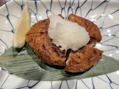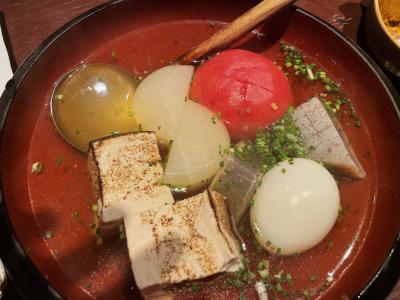 周南市に出張した折、地元の知り合いに勧められて夕食に選んだのがこの店だ。JR徳山駅周辺の繁華街から少し離れた場所にあり、環境は静か。凝った造りのエントランス、和風の室内で店内は落ち着いた雰囲気だ。この日は突出しに始まり、同僚と2人でおでんの盛り合わせと刺身の盛り合わせ、あてに単品を続々とオーダー。日本酒メニューも充実しており、次々と痛飲した。日本酒とおでん、海鮮が十分に楽しめる店だ。