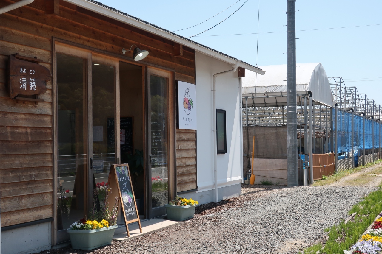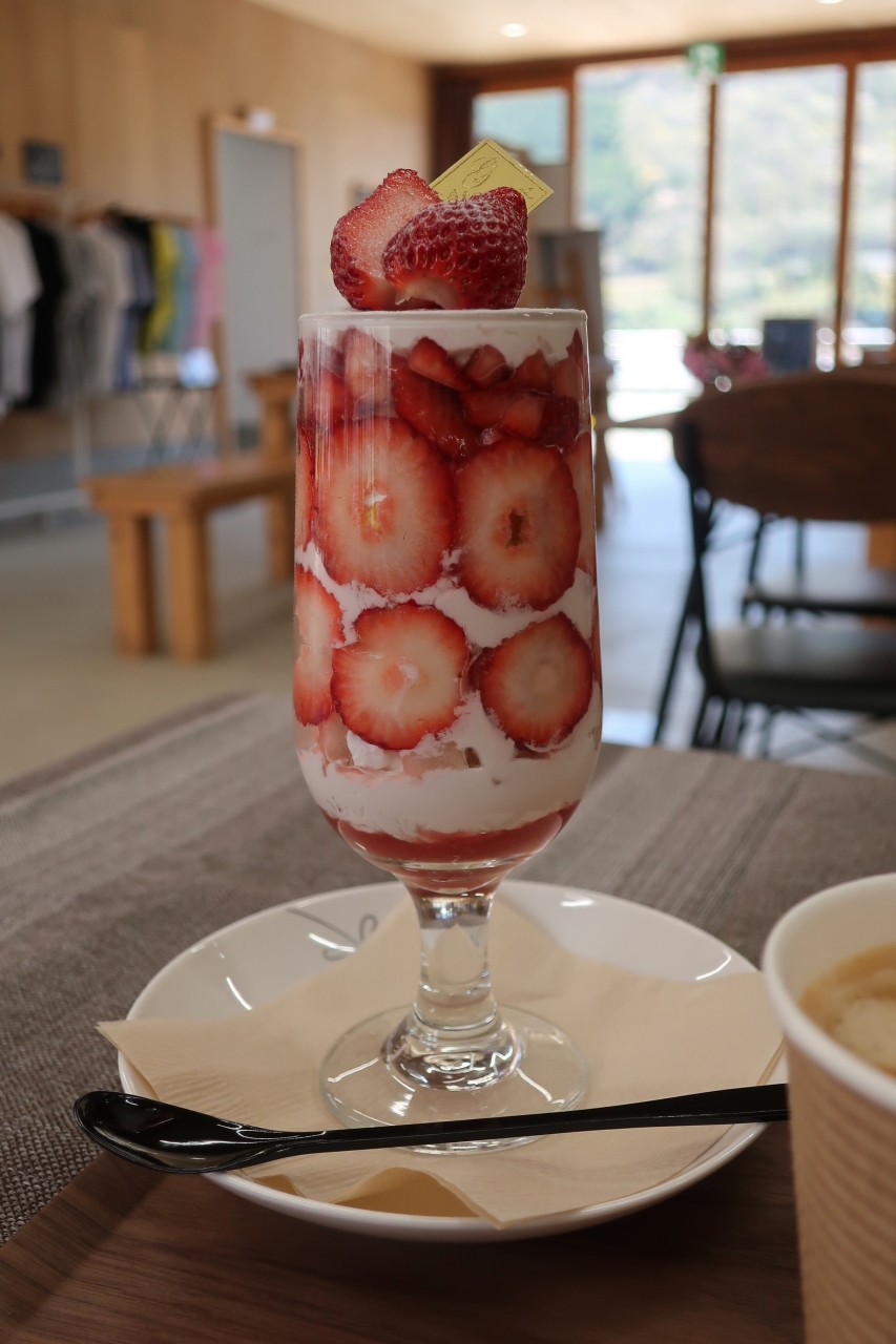 北房方面へのドライブで立ち寄りスポットの一つだ。里山に囲まれた果実園の中にあるカフェで、環境も魅力の一つだ。果実園の中にあるので当然だが、果物を使ったパフェをオーダーした。新しいメニューだというイチゴとあたご梨のフルーツパフェ。最初はイチゴ味で途中から梨の酸味に味変する。イチゴを使ったケーキもおいしそうだ。パフェ、焼き菓子なども。室内でもいいが、屋外の果実園に設けられた席も開放感があっていい。