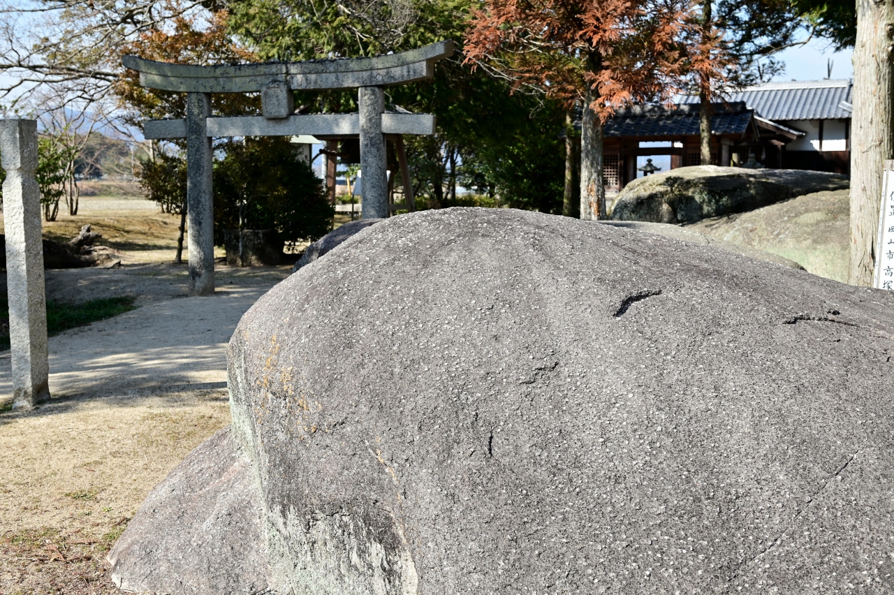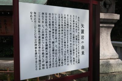 吉備津神社の北側鳥居近くにある大きな岩で、いわゆる温羅伝説の舞台の一つだ。吉備津神社の祭神である大吉備津彦命は人々を困らせる温羅を退治するために出征し、温羅が射掛けた矢を空中でつかみ取り、置いた場所が矢置岩だという。この伝説にちなんで、岩に供えた弓矢を東西南北に一斉に放ち、四方の悪魔をはらって健康と招福を祈る「矢立の神事」が現地では行われる。神社周辺にはこうした大吉備津彦命VS温羅の激戦の伝説がちりばめられているが、ゆかりの場所をたずねるのも楽しい。温羅は鬼ノ城に本拠を構え、大吉備津彦命は楯築遺跡に陣を構えたとされるし、命と温羅が互いに射た矢が空中で衝突し、その矢が落ちた場所が総社IC近くの矢喰神社だとされる。スペクタクルの舞台が神社周辺には点在しているのだ。