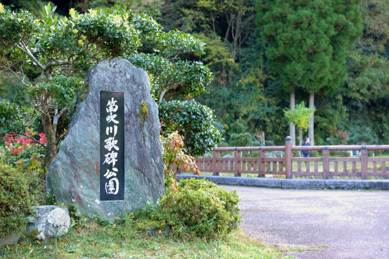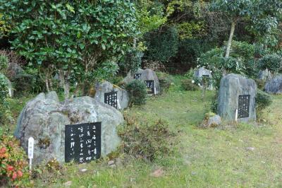法然上人ゆかりの誕生寺横に広がる散策型公園だ。約2000坪の敷地に100を超える歌碑が林立している。中央には川が流れ、ほたる祭りが開催されるという。自然を愛でながら石碑を詠みながらゆっくり巡ると、時間の経過を忘れるような楽しさがある。