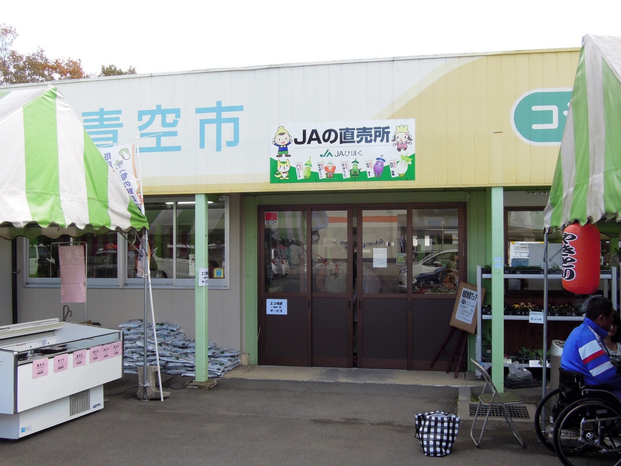 JAびほくの直売所がある。昔は農協の支所か何かだったのかもしれない。いかにも農協の建物らしい外観と構造の奥行きのある建物で、結構な量の野菜や果物が直売されていた。店頭のテントではよくイベントをやっているという。
