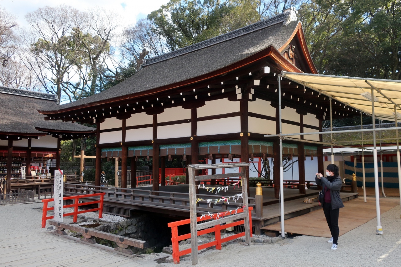 下鴨神社の境内摂社だが、社殿が井戸の上に建つため、「井上社」の別名を持つ。この井戸から湧き出るのが御手洗川となるため、川の水源地に建つ神社ともいえる。災難厄除けのご利益があるが、社殿前の御手洗池で様々な神事が行われることでも有名だ。池はさらさらと浅く、開放的な雰囲気があり、参拝客が絶えない。京の七不思議のひとつで、ここには水泡が湧き出るが、それをかたどったのがみたらし団子の始まりとされる。