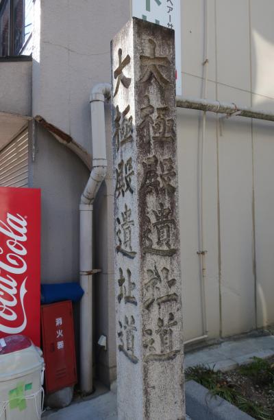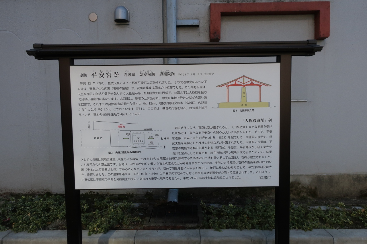 平安京に遷都した時、朝廷の正殿があった場所だ。平安末期に焼失して廃絶してしまったが、1895(明治28)年の内国勧業博覧会で再び脚光を浴びだ。明治維新後、沈滞が続いていた京都を復活させようと平安京遷都当時の大内裏の一部復元が計画され、場所として白羽の矢が立ったのが、実際に大内裏があったこの辺りだ。結局、用地買収に失敗したため、岡崎に建設された。それが現在の平安神宮だ。ただ、この事業を通じて平安京の研究が一段と深化したという。そして、一部購入した土地を利用して造られた公園に大極殿跡の石碑が立っている。