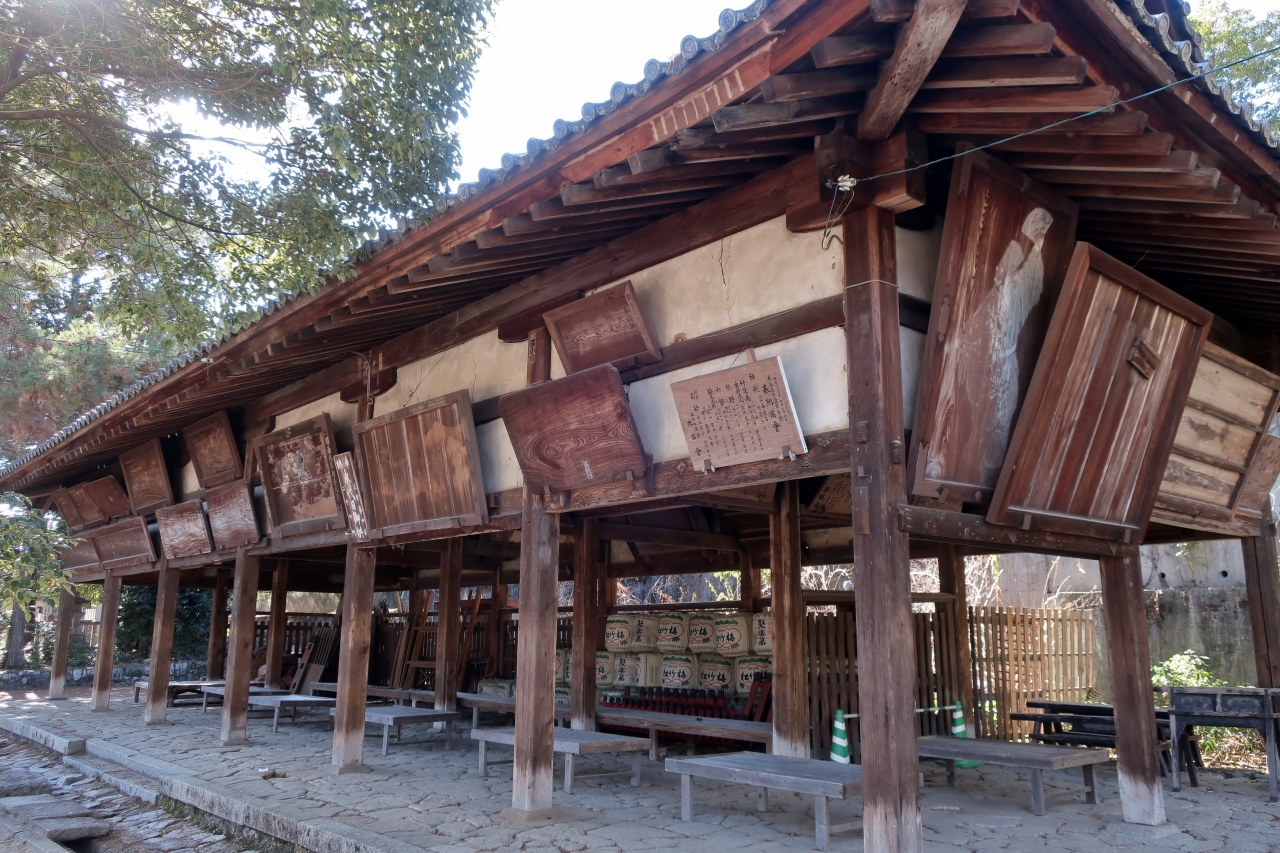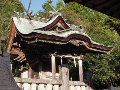 歴史上の人物である和気清麻呂を祭神とする神社で、イノシシを神使とすることから亥年には脚光を浴びる。藤の花の名所で知られる藤公園と近い。多くの人が参拝するのだろう、設備や手入れがよく行き届いた神社だ。階段を上ると比較的新しい拝殿・本殿があり、清麻呂とゆかりが深いイノシシの「狛犬」が鎮座している。いわゆる「狛イノシシ」は、やはり清麻呂を祭る京都の護王神社にもあった。いずれもご利益に<足腰の健康>が共通している。また、巨大な絵馬も共通しており、特に和気神社は大きさ日本一を公称している。鳥居の横に大きな和気清麻呂像が立っているが、なぜか矢掛町の吉備真備公園にある巨大な吉備真備像を連想した。装束が似ているからだろうか。駐車場からは朱塗りの欄干の橋が架かっており、多くの参拝客が盛りの紅葉を背景に記念写真を撮っていた。