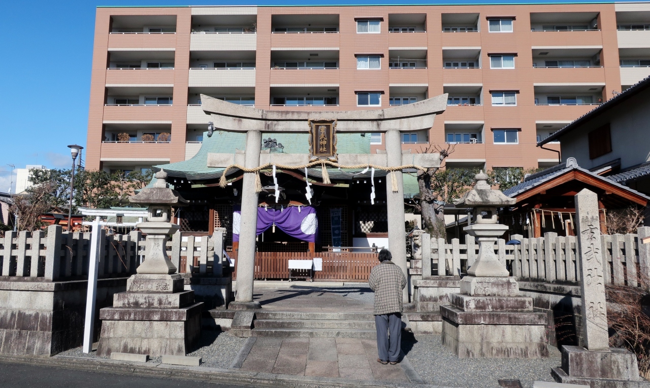 住宅地の交差点。ビルを背景に忽然と現れるのがこの神社だ。現地の説明によると、京都三大奇祭の一つとされる「玄武やすらい祭」を行うことで知られる。大きな社殿ではないが、玄武の名前を冠しているなど、どこかしら伝統を感じる神社だ。