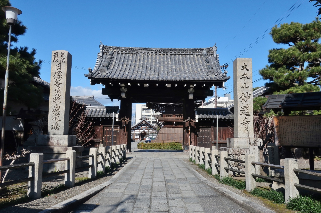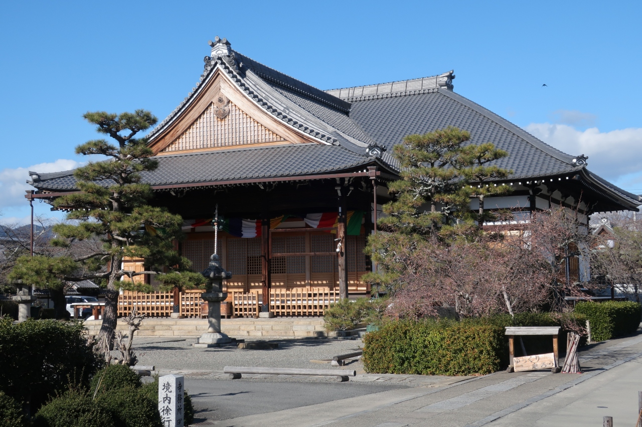 山門に結界があり、どうやら観光客には開放していないようだ。堀川通りに面した場所にある。現地の説明によると、ここは平安時代に悲田院が建てられた場所で、この寺院はその跡地に開創された。近くに後花園天皇の遺骸が火葬された場所だとする遺構が残されている。