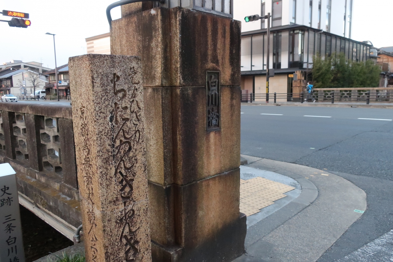 白川橋は東山通りから東に入った白川に架かる橋だ。観光スポットで有名な巽橋や一本橋の上流に当たる。この橋が有名というよりも、南側の欄干東詰めにある道標が京都における現存最古の道標として知られている。「是よりひだり、ちおんゐんぎおんきよ水みち」とある。「左(ここでは南方側)」と限定しているのは東から来た旅人に限定した案内だ。東海道から来た不案内な旅人に有名なスポットを紹介している。面白いのは「是より」のよりに合字が使われていた。