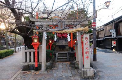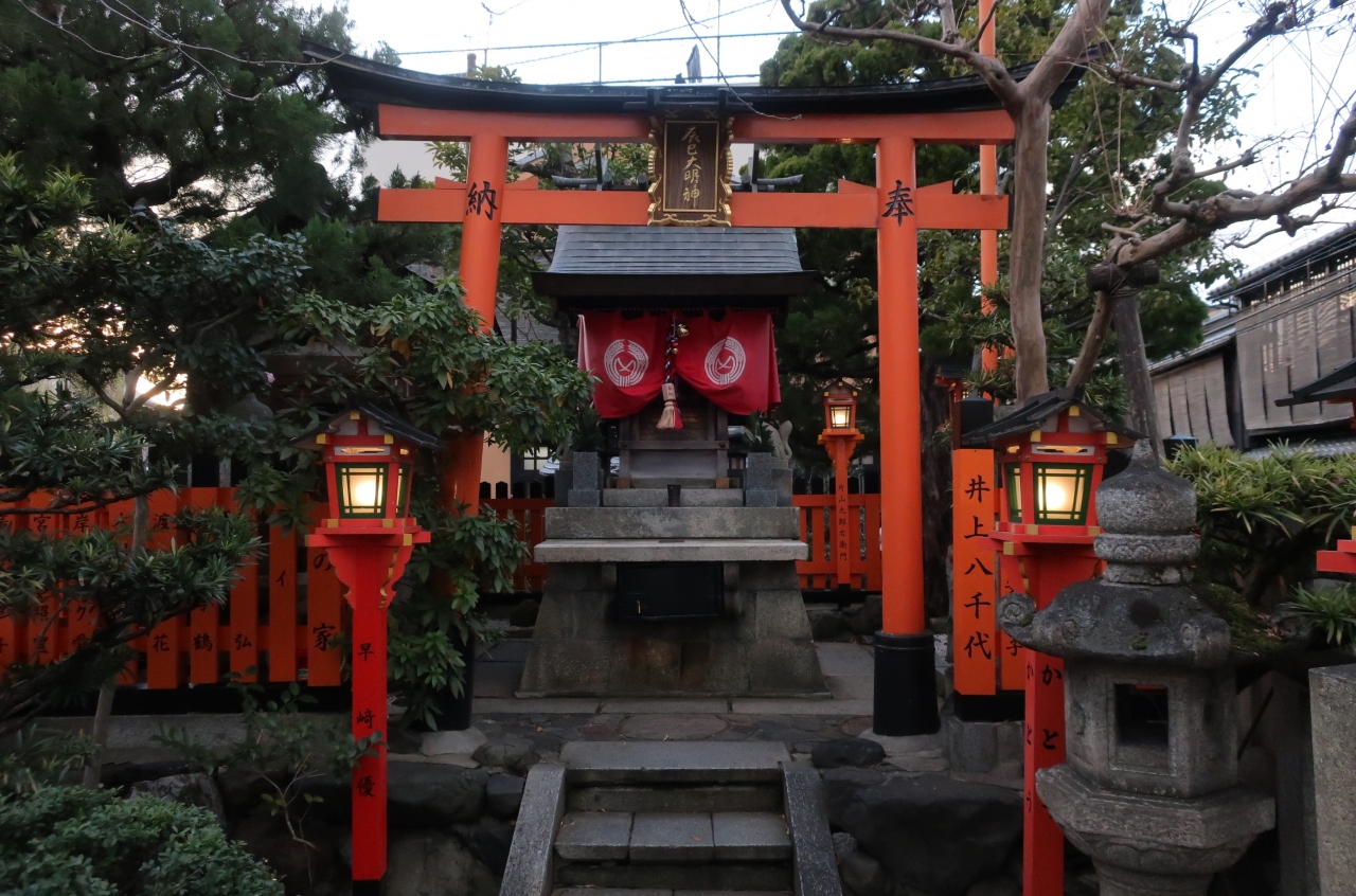 この辺りはさまざまな媒体で「京都」を象徴する映像として取り上げられているので、見覚えのある風景ばかりだ。社名は御所の辰巳の方角(南東)を守護する神様という意味らしい。さらに、ここには白蛇が祭られており、白蛇は弁天様の神使であることから芸事の上達を祈る神様として信仰を集めた。また、付近ではたぬきが人々をだまして白川の中を歩かせるなどのいたずらを繰り返したことから、ここの社に祭ったともされる。商売繁盛を願ってかお稲荷さんも祭られるなど多様な神様が同居している。奉納された瑞垣の筆頭が京舞家元の井上八千代であることからも神社に寄せられる信仰の〝格〟のようなものがうかがえる。