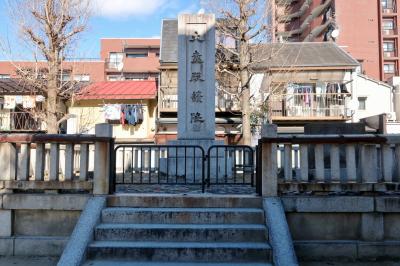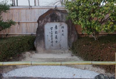 この地にオフィスを構える企業が、建立した石碑だ。1962(昭和37)年11月までこの地にあった瑞光院(現在は京都市山科区)の境内に「赤穂義士四十六士遺髪塔」が祭られていたことを記録するために碑を建てた。遺髪塔は大石内蔵助の遺志で浪士の遺髪を集めて埋めたものだという。現地には説明もあり、わかりやすく歴史的事実を伝えている。四十七士ではなく四十六士なのは、一人が切腹しなかったことに基づく。