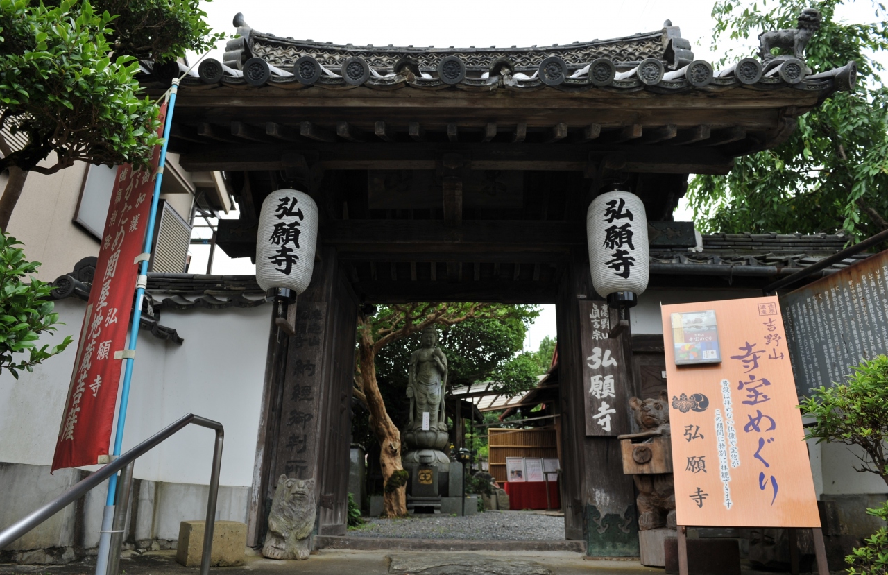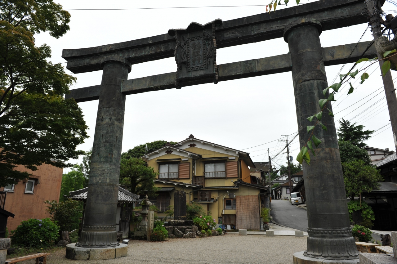 現地の「概要」によると高さ8・2メートル。創立年代は不明だが、聖武天皇が奈良の大仏を建立した際に余った銅で造ったという伝説がある。現在の鳥居は後年に建て替えられたものだ。正式名称は発心門。この鳥居は俗界と浄域の結界であり、仏道修行を発心する場所との意だ。独特の文字で描かれた「発心門」という扁額がある。吉野山から山上ケ岳までの間には発心門を含め、修行、等覚、妙覚の四門があり、この鳥居が最初の門だ。黒門からの坂を登りつめたところにあり、この辺りから門前町の雰囲気が濃くなる。