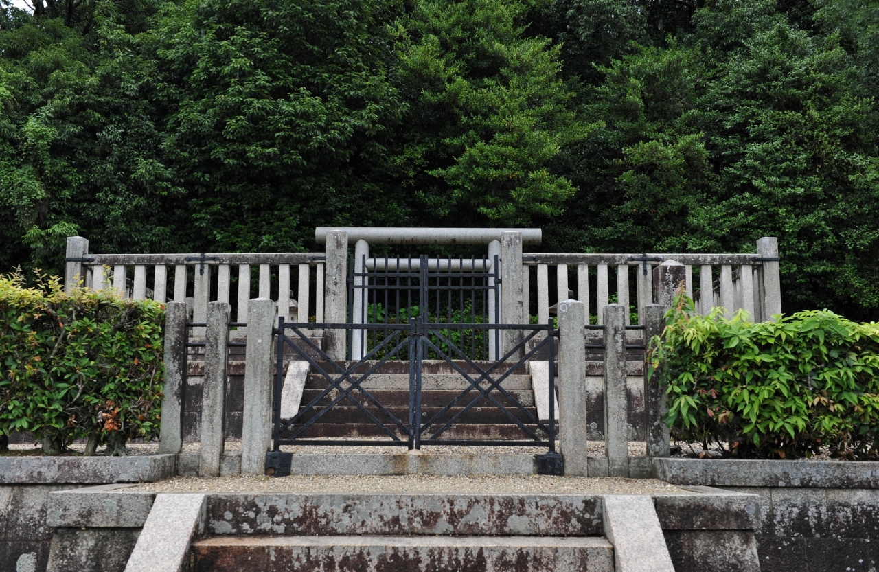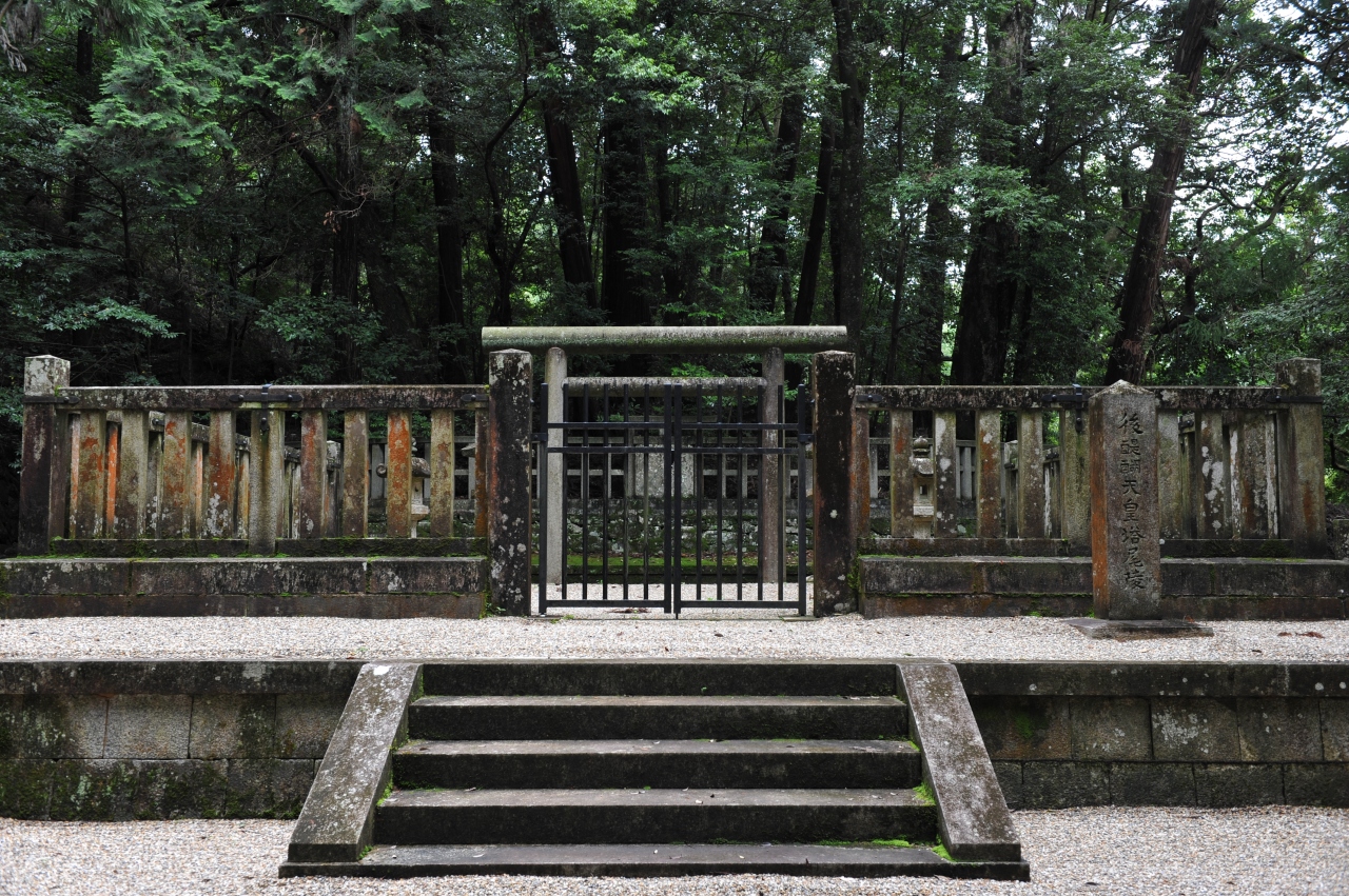 吉野の歴史を語る上で欠かせない後醍醐天皇。「身はたとへ南山の苔に埋むるとも魂魄は常に北闕の天を望まん」。この辞世に沿って天皇墓陵としては唯一北向きに設けられた。後醍醐天皇の勅願寺である如意輪寺の寺内にあり、少し小高い丘の上に境内から石段が伸びている。他の天皇陵同様、玉垣で囲まれ、正面には鳥居が置かれる。森林の中の苔むした場所。雨の日だったこともあるが、鎌倉幕府を打倒し、建武の新政を成し遂げた勇敢な天皇の墓としてはやや寂しいような気がする。近くには孫に当たる長慶天皇、その皇子の世泰親王が一緒に葬られている。