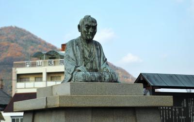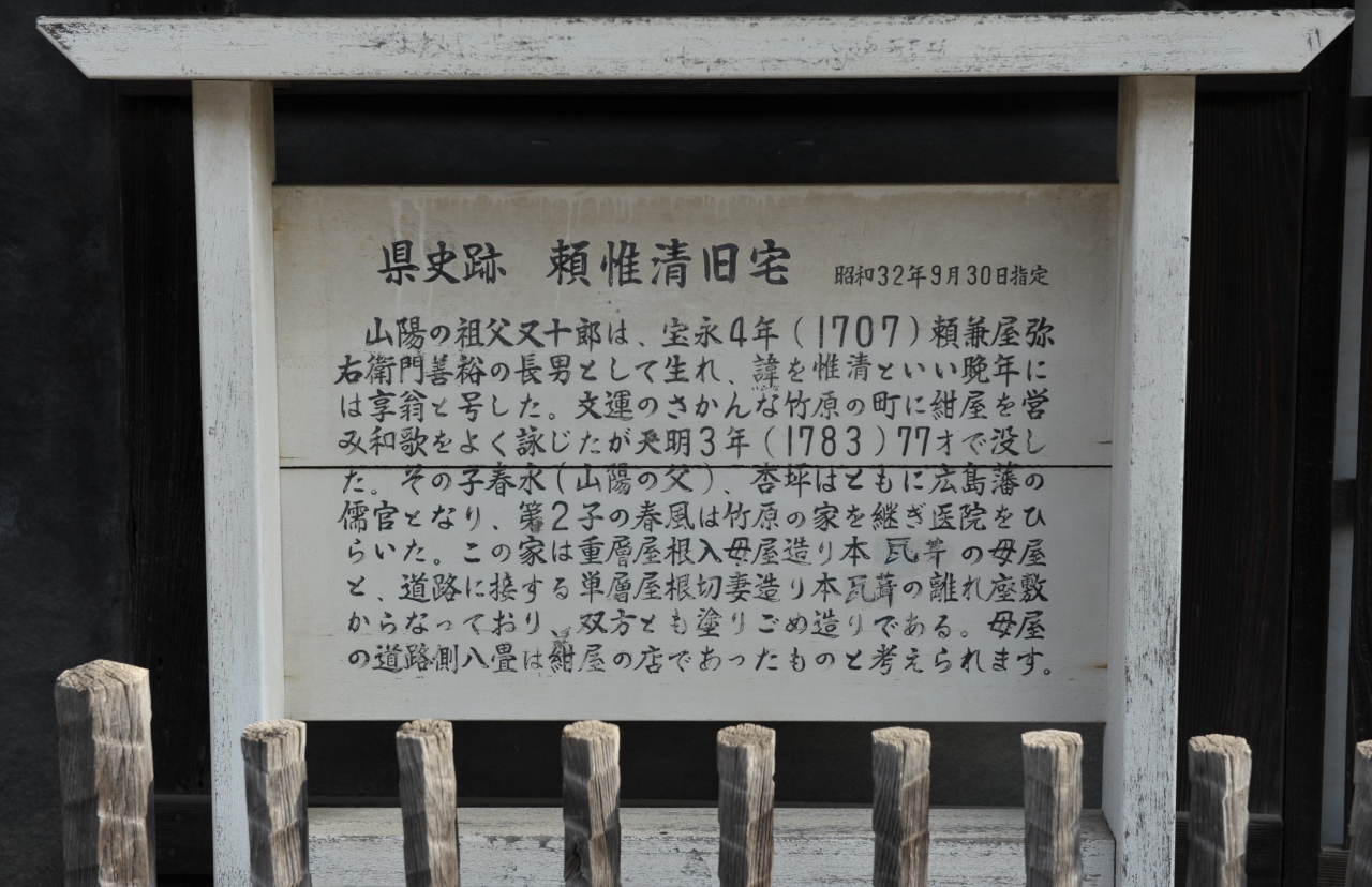 各地に頼山陽ゆかりの展示物があるが、見るたびに山陽は幕末のスターなのだとつくづく感じる。ここもそうだ。山陽そのものは大坂生まれだが、父親が竹原出身という縁だ。父親は大坂に遊学し、そこで山陽が誕生した。山陽の業績は山陽一代で成し得たものではなく、竹原での頼家の脈々とした営みが山陽で開花したのだ。そう考えればこの広場が竹原にあるのも納得がいく。現地には山陽の銅像と川中島合戦の漢詩で著名な「鞭声粛々」の一節が石碑となっていた。像は山陽の生誕200年を記念したものだという。