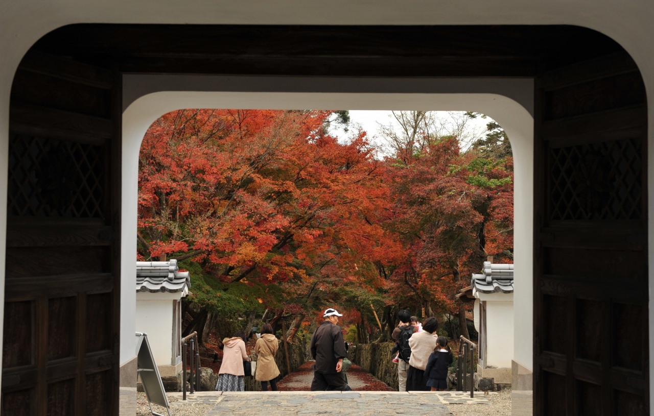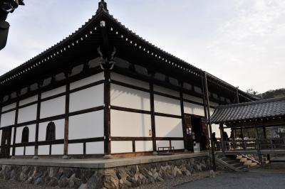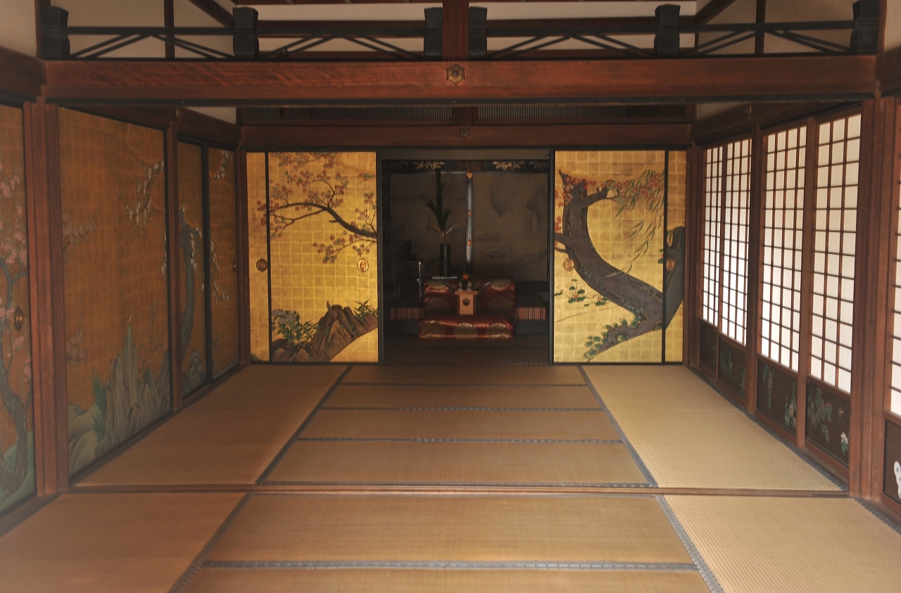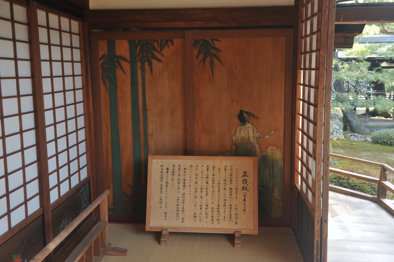典型的な書院造りの建物だ。法皇が院政を敷いた場所で、御冠の間という名前の部屋があるが、その由来は執務の際に冠をその部屋に置いたことに伝わるという。南北朝時代に南北朝の講和をはかる会議がここで行われた歴史的な場所でもある。金箔を下地に絵が描かれたふすまがまぶしい建物だ。