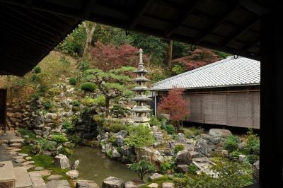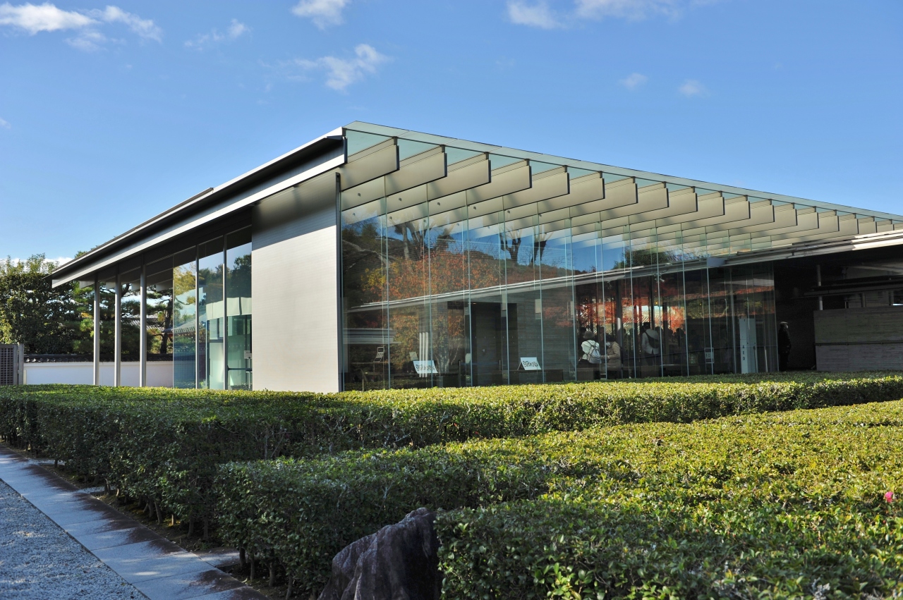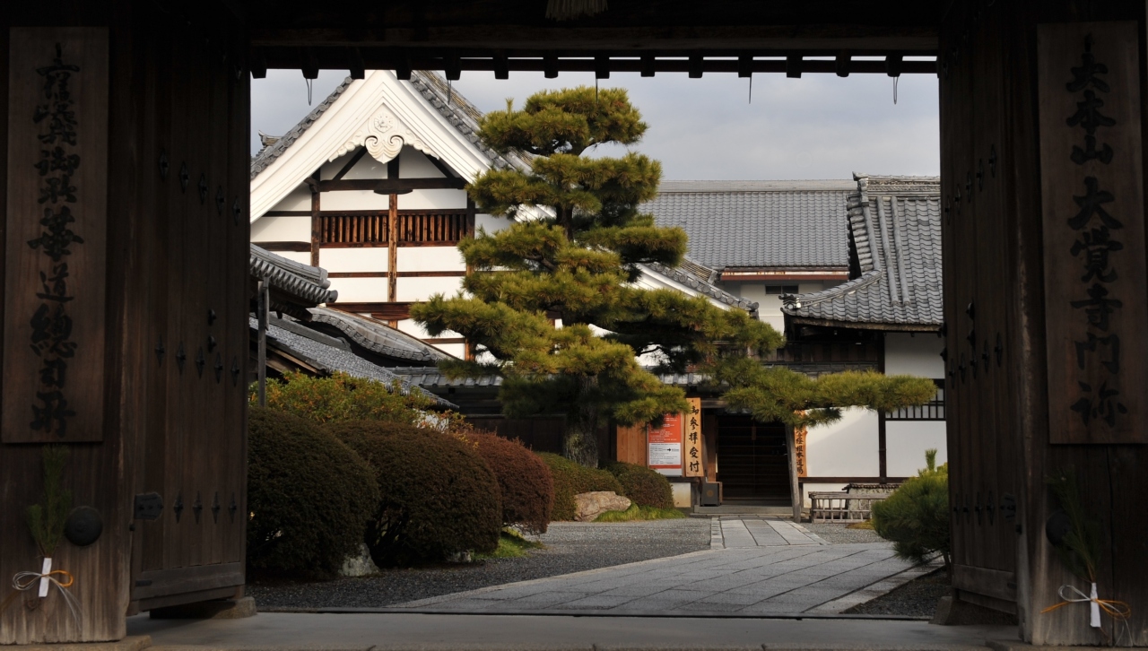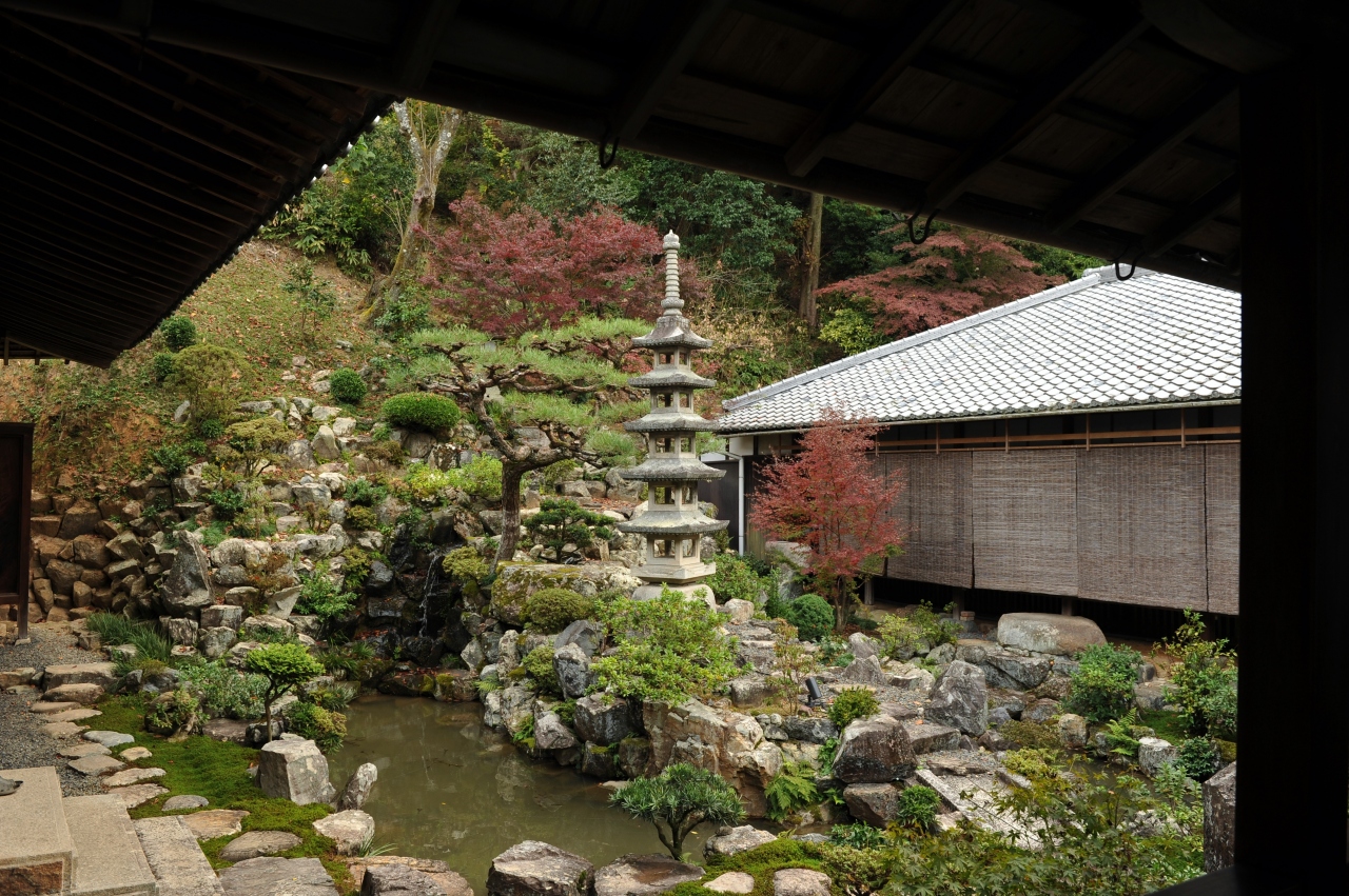 典型的な書院造りの建物だ。法皇が院政を敷いた場所で、御冠の間という名前の部屋があるが、その由来は執務の際に冠をその部屋に置いたことに伝わるという。南北朝時代に南北朝の講和をはかる会議がここで行われた歴史的な場所でもある。金箔を下地に絵が描かれたふすまがまぶしい建物だ。