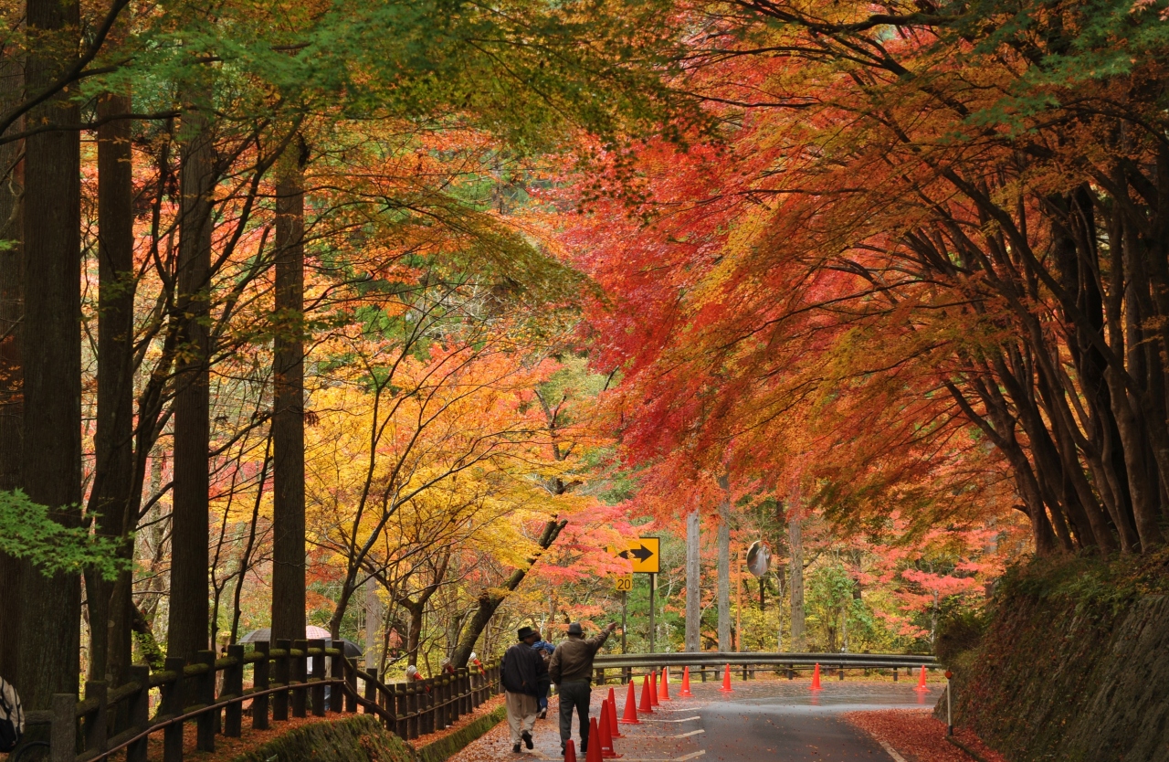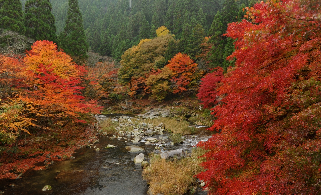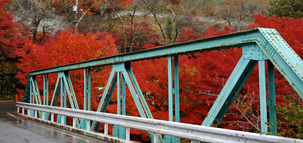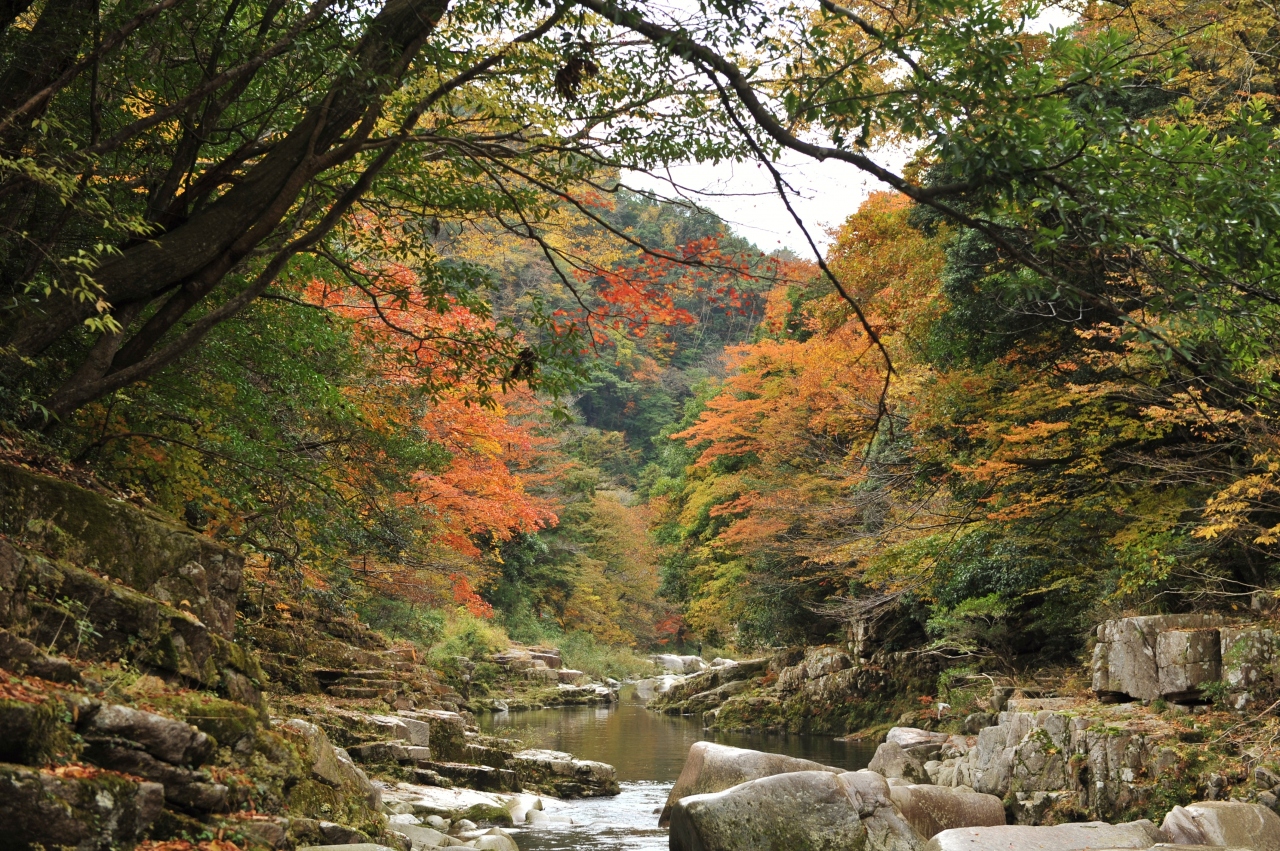 国道179号(奥津上齋原バイパス)と並行して走る旧道沿いの渓谷で、紅葉の名所として有名だ。2020年の紅葉シーズンはコロナ禍の影響でシャトルバスの運行が中止になったが、道路は一方通行で運用されており、マイカーで渓谷に入ることができた。11月上旬だったが色づきはすでに「満開」だ。渓谷沿いに歩き、ダイナミックな断崖の紅葉を満喫した。さらには岩石の表面にクレーターのように穴ができる「甌穴」がそこここで見ることができる。また、大釣橋近くの紅葉は庭園のように集合しており、橋と川と紅葉の絵に紅さも含めてしばらく見とれた。例年であれば紅葉シーズンの休日のマイカー乗り入れは不可で、シャトルバスを利用することになる。ともかく、歩く用意が不可欠だ。