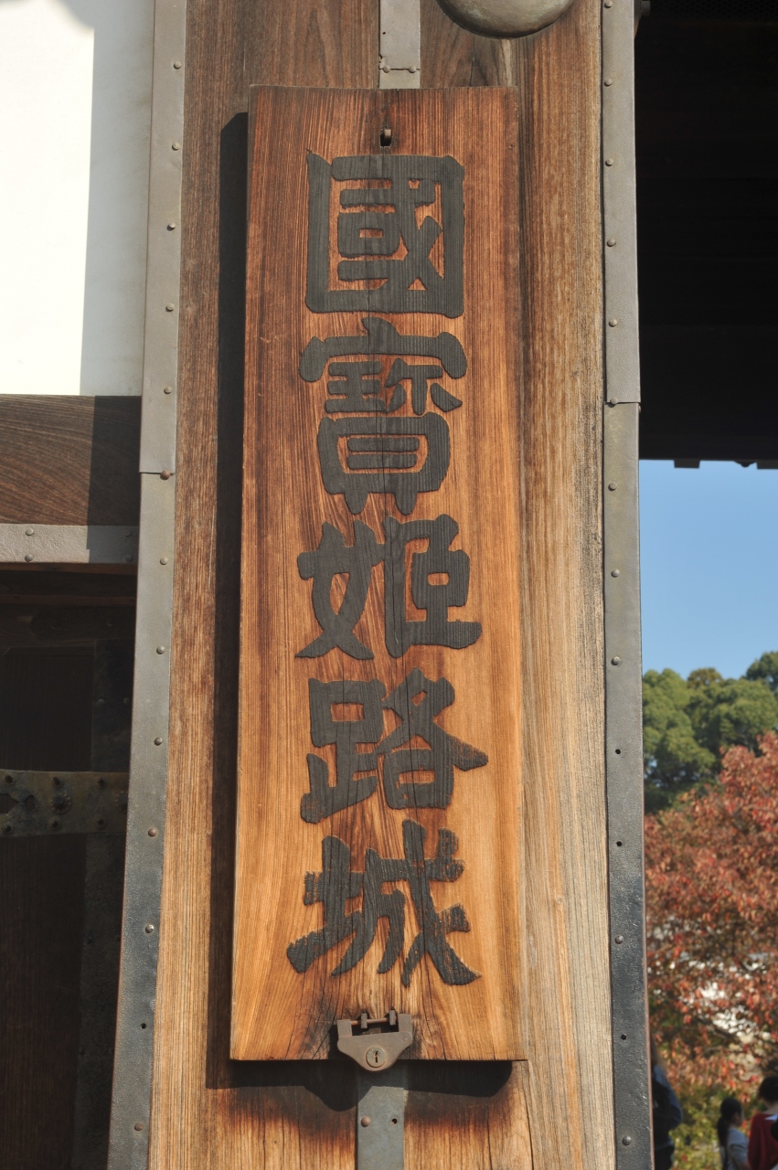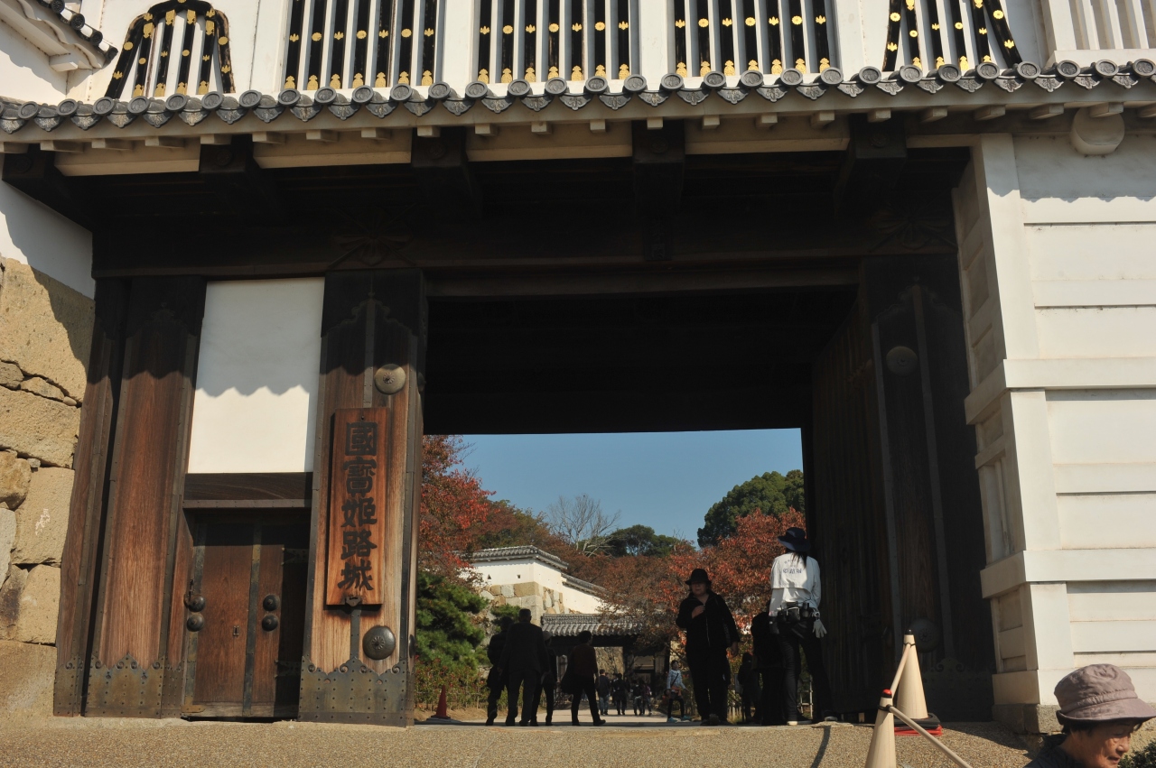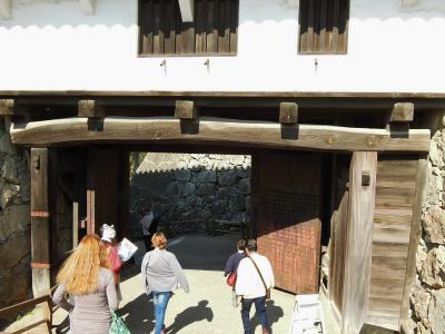 天守閣の見学を終えた後に通る門だ。扉は鉄板で覆われ、いかにも守備力が高い門だが、美しい漆喰、二重の櫓の意匠など非常に装飾的でもあり、実用性と芸術性を完ぺきに備えた城郭芸術と言いたいぐらいの素晴らしさだ。入り口の通路も曲がっており、やはり戦闘装備なのだと思わせる。