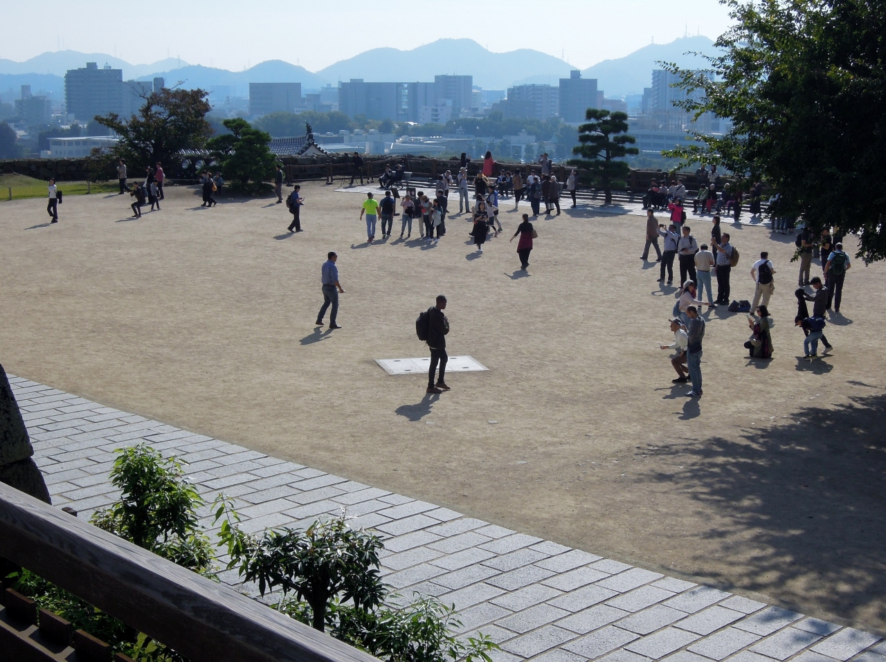 大天守を見上げるような場所にある広場だ。現在の姫路城を築城した姫路藩主の池田輝政がこの備前丸の場所に御殿を建てて住まっていたという。また、客と会見する対面所なども置かれていたらしい。その後、御殿は明治15年の火災で焼失し、大天守のすぐ隣にぽっかりと広場が残った。見学を終えてから通る場所なので、何やら近代的な公園のよう。