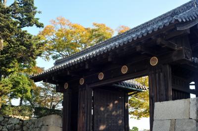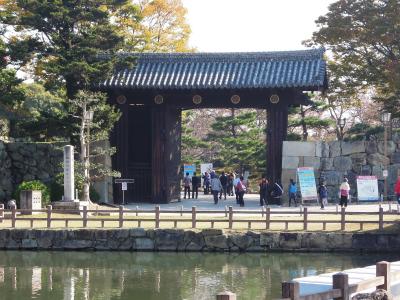 大手口に昭和初期に建築された門だ。もともと大手口があった場所で三つの門が設けられていた。明治時代に入って取り壊され、昭和に入って再建されたというから忙しい。高さがある門だが、建築時に軍事用車両の通行を想定していたという。正面にいくつも掲げられた五七桐紋が威厳ある雰囲気を醸し出している。