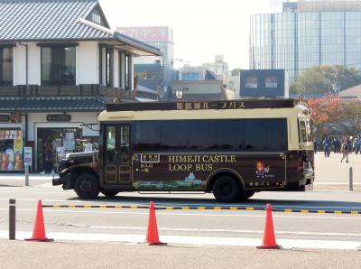 姫路観光はJR駅と姫路城の間を周遊する。駅と城を一往復すればいいものではなく、例えば好古園に行ったり、城を挟んで反対側の射楯兵主神社に行ったりすれば結構な距離になる。一筆書きのルートで歩ければいいのだが、そうもいかない。そんな時に要所要所の移動に使うと便利なバスだ。一回100円だが、一日券が300円であるので使いようによってはお得なチケットだ。一日券は最寄りの施設の入場料が安くなる特典も。ボンネットバスが目印。