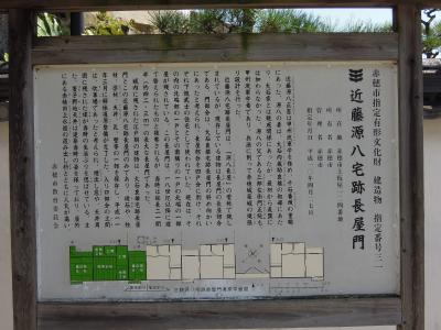 赤穂城内に残された江戸時代の建物は大石内蔵助の屋敷跡と、この近藤源八宅跡長屋門だけだという。近藤源八は内蔵助の親戚筋だったが、討ち入りには加わらなかったという。平成時代に解体修理を受けており、現地には観光客にもわかりやすい親切な説明版が掲げられている。