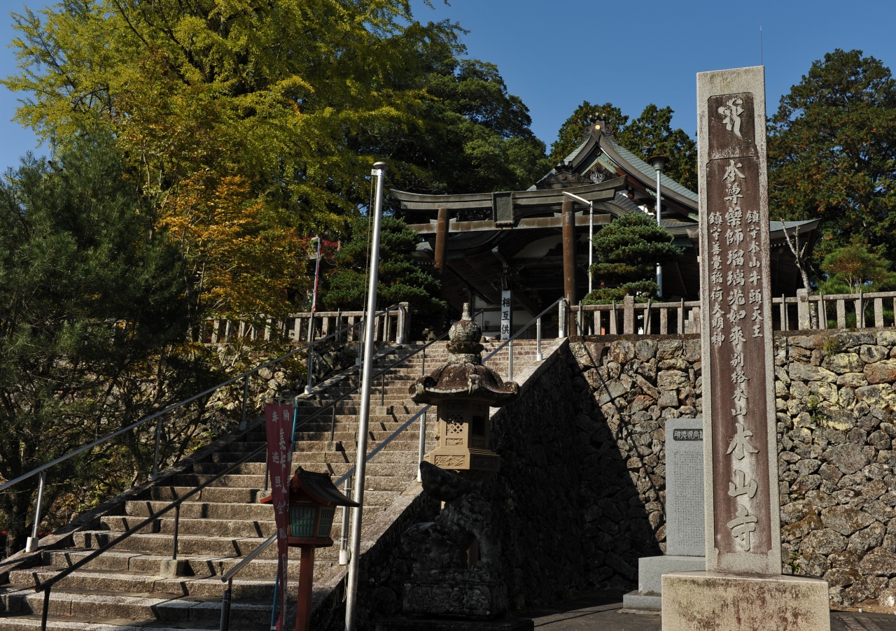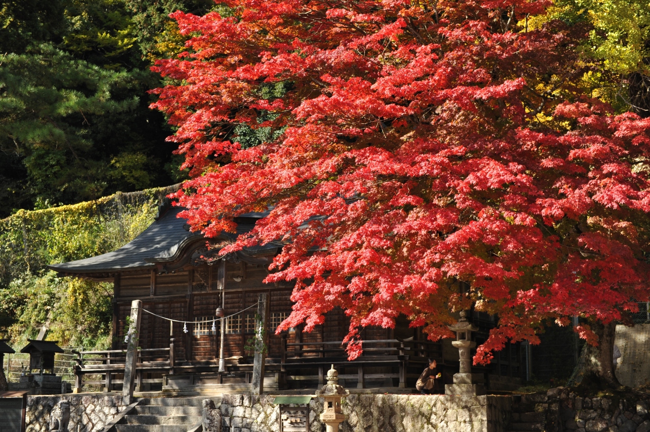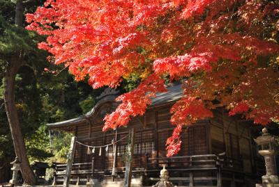 地元の観光ホームページには「隠れた紅葉名所」と紹介されていたが、行った時はぞくぞくと車が止まっていた。みな、写真ファンかカップルのようだ。真っ赤な紅葉とイチョウの黄葉、背景として神社の本殿が見事な競演を繰り広げている。しかも色づいた木々は一本ずつしかないので写真撮影の滞在時間は短く、周辺に渋滞などは生じていない。かつては神仏習合の神である牛王天王を祭っていたが、牛王天王が本地とされるスサノオノミコトなどを祭っている。