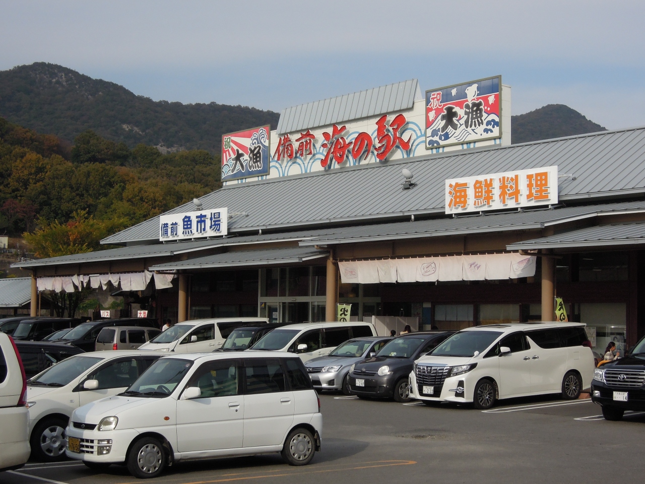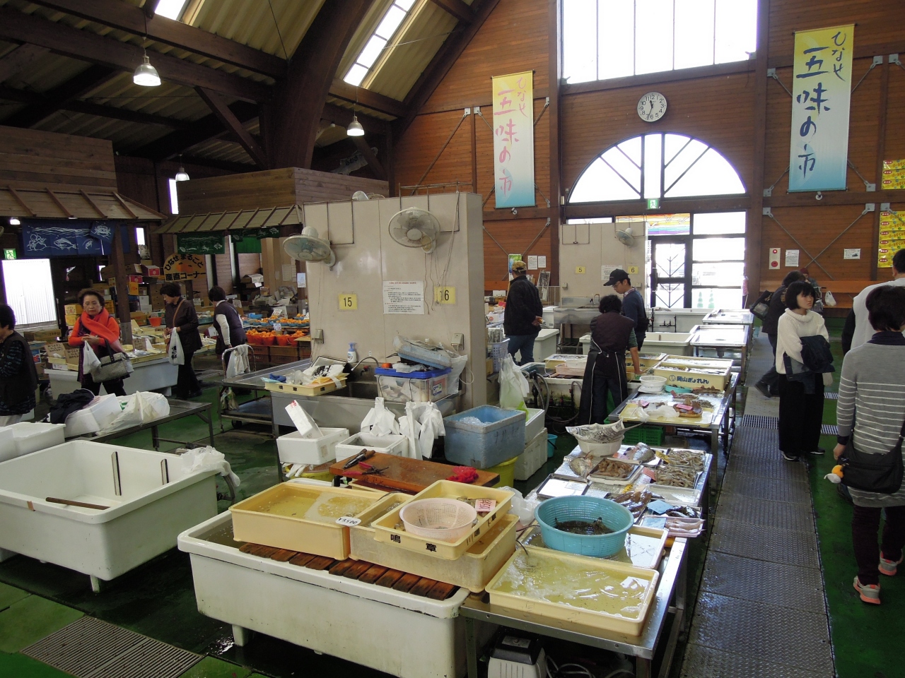 港の近くにあるいわば<海の駅>のような施設。海産物を扱っていて、外には屋台が、内には魚屋さんが並ぶ。施設外にもカキオオの店やここで買った魚をバーベキューできる施設があり、大勢の人でにぎわっていた。この日は正午過ぎに行ったが、数店は売り切れていて閉店していた。カキオコを食べた後に足を運んだので購入しなかったが、カキ入りの味ご飯はとてもおいしそうだ。