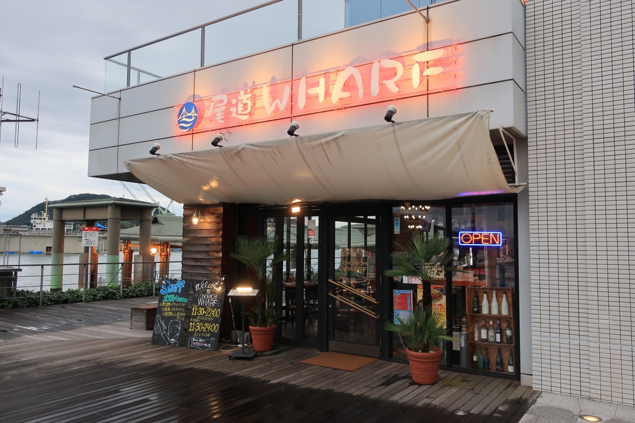 JR尾道駅前のいかにも新しく整備されたエリアにあるレストランだ。尾道水道沿いに整備されたボードウオークに囲まれたビルの一角にあり、壁がガラス張りの室内からは海岸沿いの風情が満喫できる。この日は20人程の団体で繰り出し、飲み放題を付けたコース料理を満喫した。サラダ、カキフライ、ピザ、チキン、パスタなどを夜の尾道水道を見ながら楽しんだ。カウンターのほかテーブル席、テラス席があり、駅前の立地相まって使いやすいレストランだ。