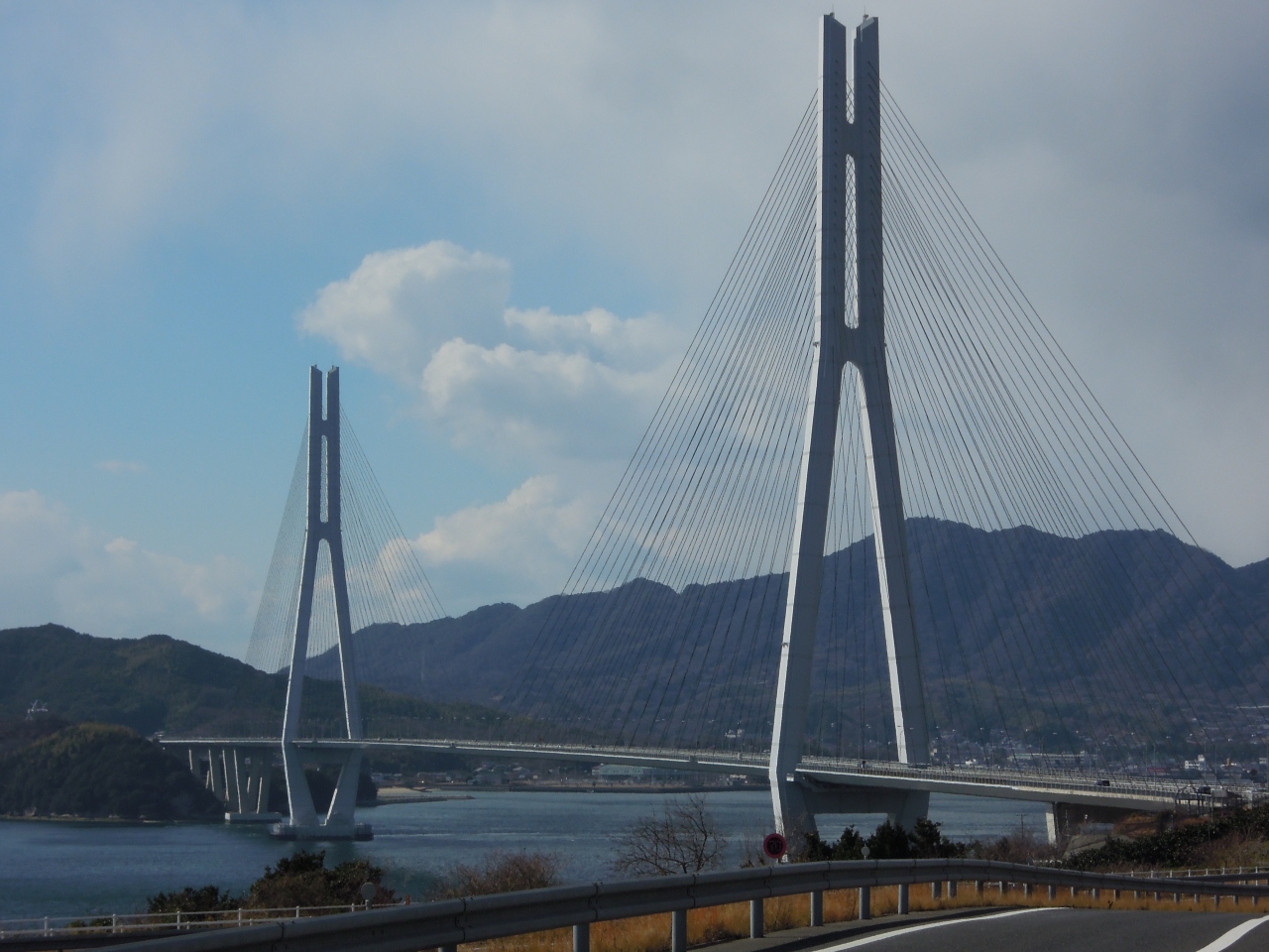 瀬戸田パーキングエリアからじっくり見ることができるが、とても美しいプロポーションの橋だ。美しいばかりでなく、完成時の長さ890メートルは世界最長の斜張橋だったという。技術的に難しく長い橋が造りにくいというが、その難しさがこの橋の美しさを演出しているかのようだ。場所は広島と愛媛の県境。