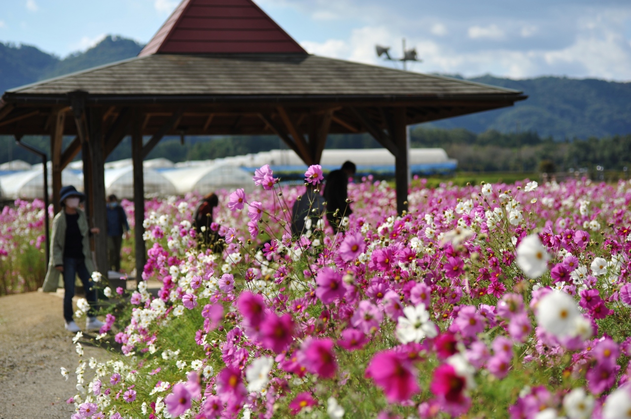 2020年はコロナ禍のためイベントそのものは中止だったが、コスモスは咲き誇っていた。JAの直売所の後背に広がる敷地に無数のコスモスが咲き誇る。普通のコスモスよりも大輪のコスモスのようだ。濃いピンク、薄いピンク、白色の3色が入り混じる構成だが、不思議なことに花はある一方の方向を向いている。その方向に回りこむと、一斉にコスモスがこちらを向いた写真が撮影できる。とても手づくり感満載のイベントだが、年に一回、コスモスを見るために北房町に足を運ぶのは悪くないことだと思っている。