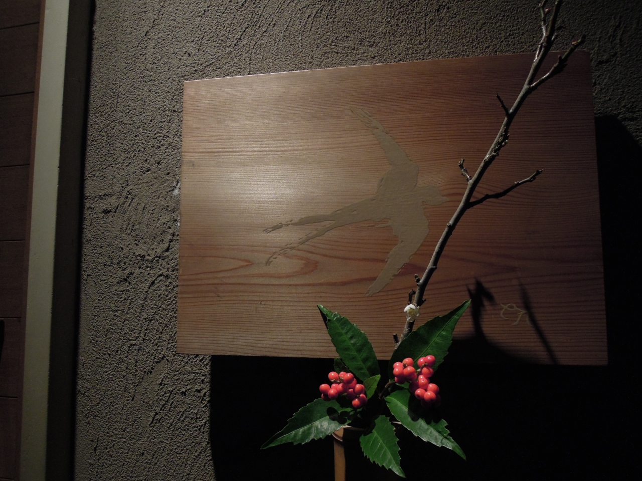 JR京都駅八条口から5分ほど歩いた京都アバンティの裏にある。大きな看板があるわけではなく「燕」のエンブレムが目印だ。この日は1月で、センリョウが飾ってあった。イタリアンのような扉を開けると右にL字のカウンター、左に2人がけのテーブル席がある。アラカルトだったが、お勧めに従って刺身の盛り合わせ、自家製ソースのビフカツ、堀川ごぼう、エビイモのから揚げ、たらこの粕漬けなどを注文した。八寸に正月の縁起物をそろえるなど季節感にあふれた献立が並んでおり、四季折々に楽しんでみたい店だ。店主はニューヨークで料理人をやっていた経験があり、その時に大好評を博したというラーメンのメニューが置かれていたが、ふしぎな感覚だ。女性店員の方の接客がとてもよく、好感度が上がった。