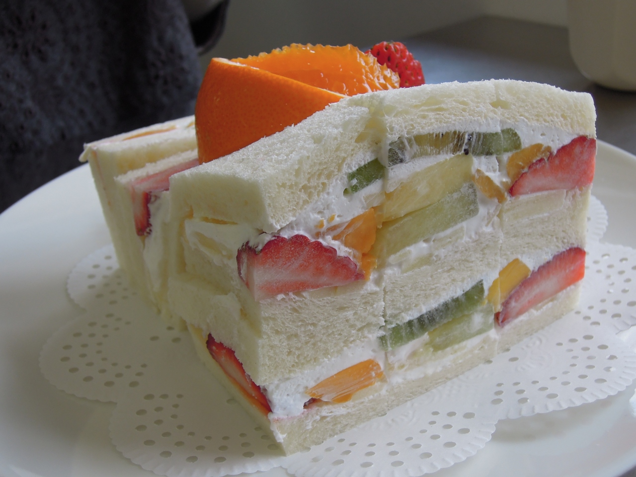 子供のころよりもフルーツサンドのおいしい店が増えたような気がする。生クリームをバターの代わりにたっぷりと塗り込んだところに高価なフルーツをサンドするなどというぜいたくが一般庶民に許されるものかと思っていたが、最近はバターも高価だから生クリームの方が安価かもしれない。ここもフルーツサンドのショップで、平野神社に参拝した帰りに見つけた。入店するとウインドーがあり、奥にイートインがある。フルーツサンドとグレープフルーツのゼリー、コーヒーをオーダーした。フルーツサンドは断面が鮮やかで食欲を呼ぶ。ゼリーは実をくりぬいたグレープフルーツを器にしており、食べる前にふた部分に残ったフルーツを手で絞って、果汁をかける。果汁とホイップとゼリーがあいまってさわやかな味だ。
