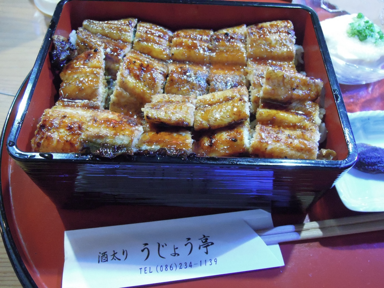 奥さんがおいしい店があると聞き込んできたので昼食時に訪問した。岡山市の中心部にある中国銀行本店近くで、とても寄り付きがいい場所だ。カウンターと座敷のテーブル席がある。天然ものはなく、養殖ものと書かれたうな重を頼んだが、これがうまかった。ご飯の上にびっしりとウナギが敷き詰められている。そう表現したいほど量は多く、脂ものっていた。が、決して胃にもたれる類ではない。あっさりめのタレがとてもいい。この店でウナギと並ぶ名物は大将の話好きだろう。他のテーブルでウナギを出されたお客がしばらくは箸がつけられないほどマシンガントークがさく裂していた。その大将によると、天然もの(青ウナギ)は100グラム×2800円で、注文は一本(一匹)が原則。よって夏や秋は単体が大きく育っているため、一人では食べきれない量になってしまう。複数人で平らげるなら問題はないが、もしも少人数で天然ものを食するなら夜の部に来てほしいとのことだ。どんぶりにすればご飯も合わせて結構な量になってしますため、それよりもかば焼きや白焼きにして一献傾けながらつつくのがいい、ということだろう。