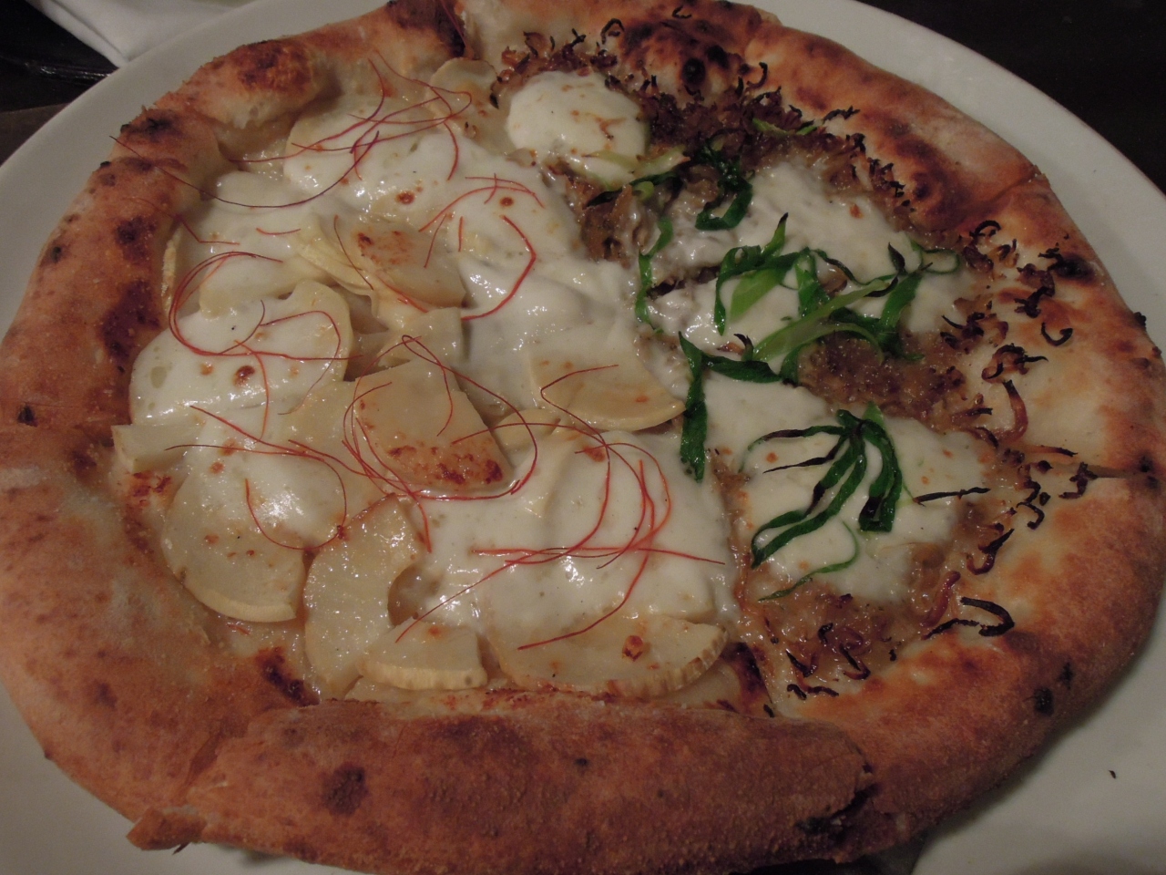 京都の、おそらくは商家をリノベーションしたおしゃれな店舗だ。間口は狭く、ウナギの寝床式の店舗。入り口にあしらった植物や手水鉢もセンスがいい。店内は右側にカウンター席、左側と奥にテーブル席を展開する。何より存在感があるのはカウンター内部に据えられたピザ窯だ。この日はカウンターで作業を見ながら食事を楽しんだが、ピザが焼けるのが早いのに驚いた。輻射熱であっという間に焼けるのだ。左右の具材が違うハーフのピザを数種類と、京都の生産者がわかる焼き野菜などこだわりの材料を使ったメニューを満喫した。