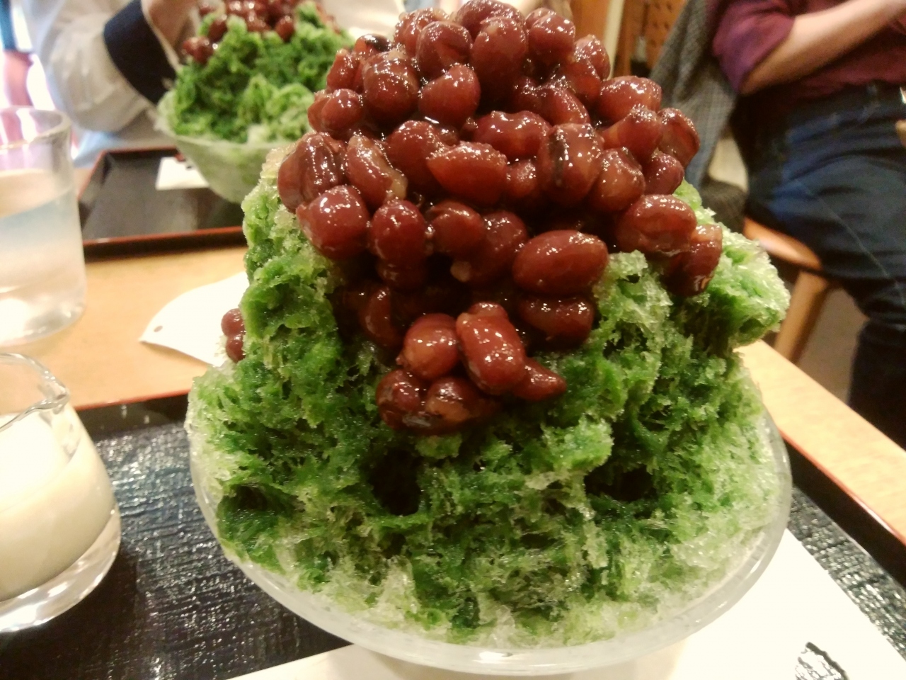 河原町今出川の交差点を少し上がったところにこの店はある。豆餅で有名な「ふたば」の反対側だ。この日は鞍馬山から貴船に抜けるミニハイキングから叡山電車で出町柳まで戻った後、かき氷を食べに入った。残り1席に運よく滑り込んだが、土曜日の昼下がりだったので満席だ。水が運ばれてくる間に待つ人の列がドアの外にできていった。外観は和風の落ち着いた造りだったが、内装も静かな印象のしつらえだ。こうした店構えが間口を広くしているのか、客層も家族や若いカップルまで幅広い。この日は夫婦ともども宇治金時をオーダー。味わい深い抹茶味にハイキングの疲れをいやした。