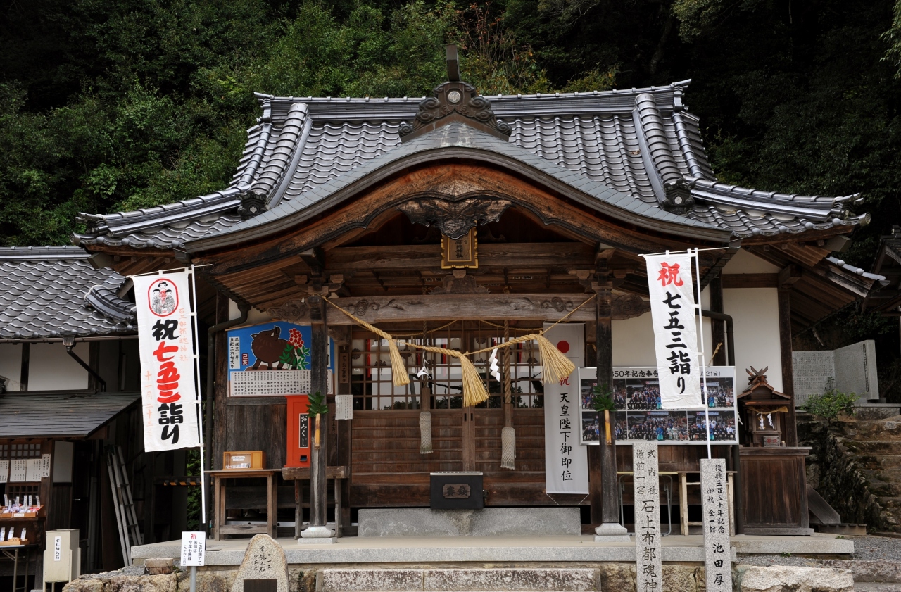 明治時代まではスサノオがヤマタノオロチを退治したときに用いた剣「天羽々斬剣(あめのはばきりのつるぎ)」がご神体だったという。変わった神社名だが、この剣は「布都斯魂剣(ふつしみたまのつるぎ)」と呼ばれることもあるから、これが起源かもしれない。さらに天羽々斬剣は最古の神宮とされる石上神宮(奈良県天理市)に移されており、「石上」の名も何か共通項がありそうだ。場所は自動車でなければ参拝が難しい山中だ。さらに駐車場から急な傾斜の参道をしばらく歩く。奥宮もあり、完全な参拝には根気も必要。歴史がある神社だが、御朱印やお守りなどの自販機があるなど先進性も。