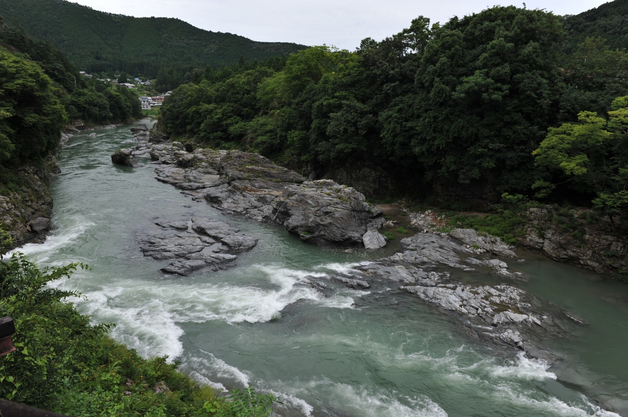 宮滝は飛鳥時代などに吉野離宮が置かれており、持統天皇など多くの貴人が足を運んだとされる。涼しい風が吹くエリアで、別荘のようなものだったのかもしれない。宮滝で吉野川に象の小川が流れ込む辺りは「夢のわだ」と呼ばれている。もともと「わだ」は、地形の湾曲している場所を指す言葉だが、この周辺は神仙郷のように夢に見るほどの「わだ」だったのだろう。古来から有名で、万葉集でも大伴旅人が「我が行きは久にはあらじ夢のわだ瀬にはならずて淵にしありこそ」と詠んでいる。象の小川が流れ込む辺りは白い筋が川面に走り、一帯のがけや川辺には奇岩が連なる。これを上から見下ろす吉野川展望デッキからの風景は絶景だ。