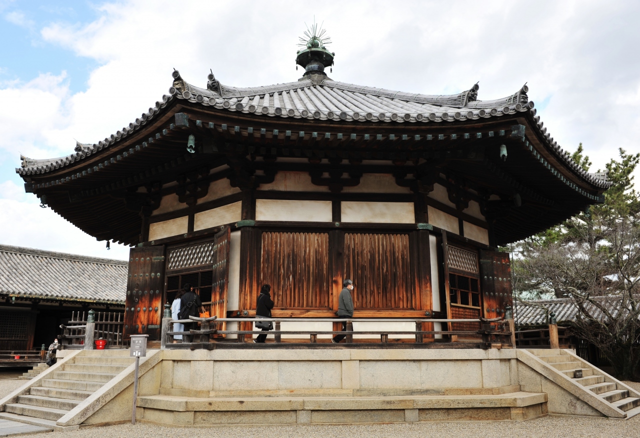法隆寺の東院伽藍にある流麗な八角円堂だ。奈良時代の建築物だが、鎌倉時代に軒の長さを深くして屋根の勾配を急にするなどの大改修を受けており、形は鎌倉期だ。古材の跡から元に戻すことは可能らしいが、昭和の大改修ではあえて奈良期の姿に戻さなかったという。戦後の一時、紙幣にも採用されたなじみ深い姿だ。八角形は古墳で言えば天皇陵に採用された形であり、聖徳太子関係の建築に八角形が採用されているのは共通する理由があるのだろうか。かつて二百年間も非公開だった秘仏の救世観音菩薩立像を安置している。