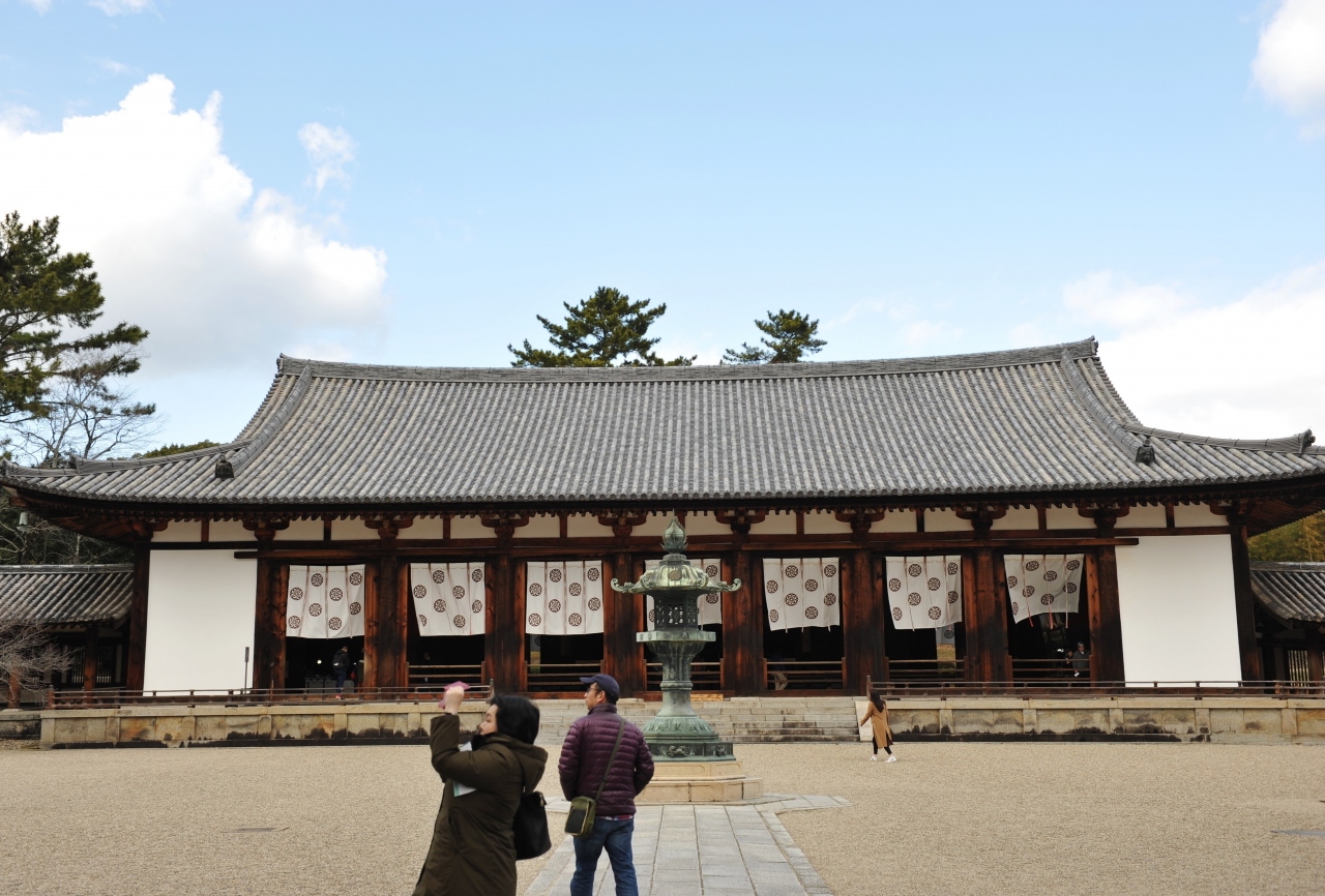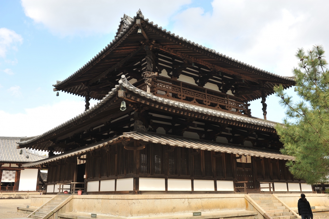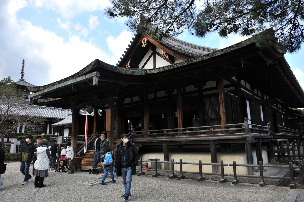 大講堂は僧侶たちが学ぶ場として建設されたものだ。もともと西院伽藍の後ろにあったらしいが、平安期に焼失。再建時に伽藍内に建築され、回廊も接続された。九間の横長な建物だが、中門側から見ると金堂と五重塔を従えてこれが本堂ではないかと思うような貫禄がある。法隆寺の中で最大の建物だ。また、大講堂側から見た西院伽藍も非常にバランスが取れていて美しい光景だ。