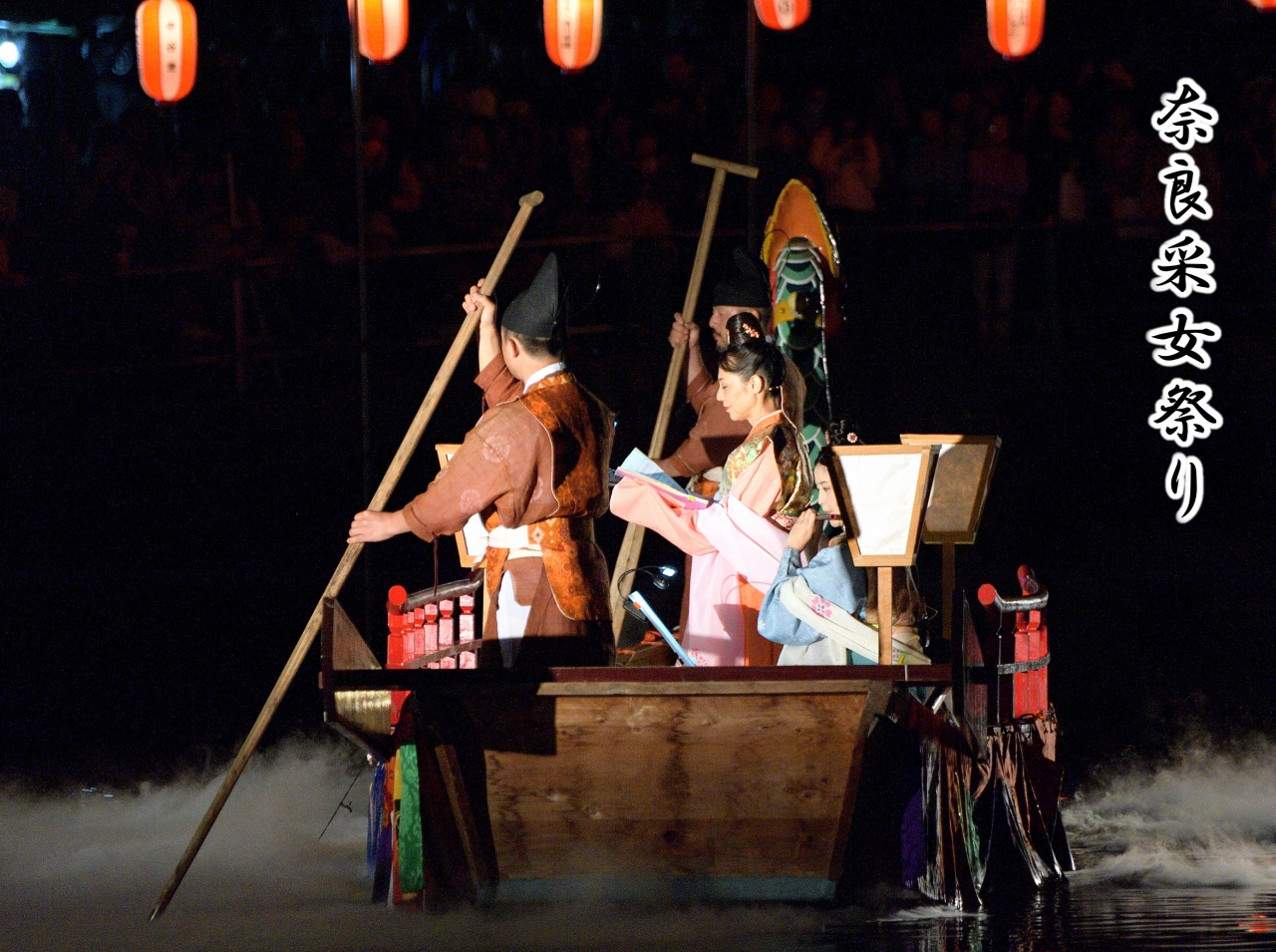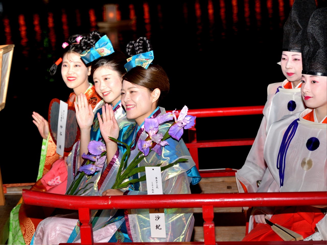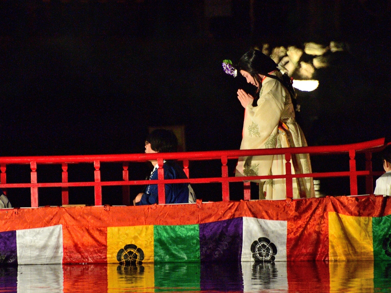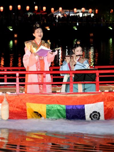 その後、花扇を神前に飾り神事が行われ、午後7時頃から、猿沢池で中橋玲子さんが采女物語を朗読しながら池を1周。その後、花扇や、花扇使・ミスうねめ・ミス奈良を乗せた2隻の管絃船(龍頭・鷁首)が池を2周して最後に花扇が池に投じらます。