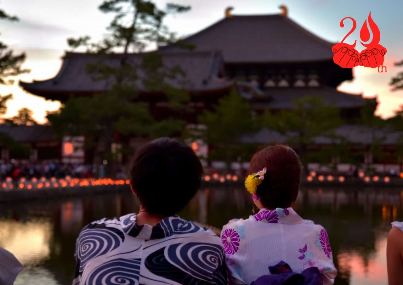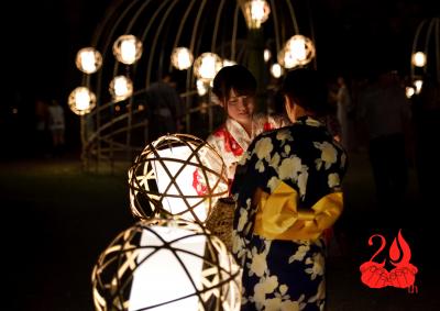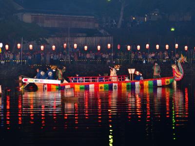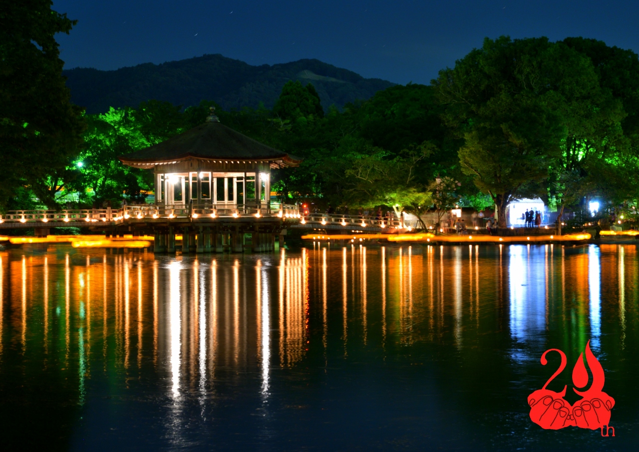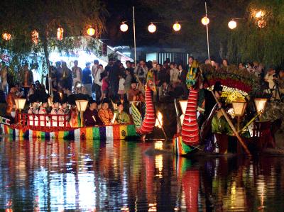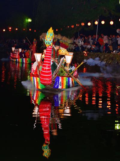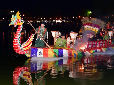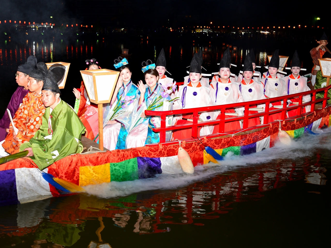 その後、花扇を神前に飾り神事が行われ、午後7時頃から、猿沢池で中橋玲子さんが采女物語を朗読しながら池を1周。その後、花扇や、花扇使・ミスうねめ・ミス奈良を乗せた2隻の管絃船(龍頭・鷁首)が池を2周して最後に花扇が池に投じらます。